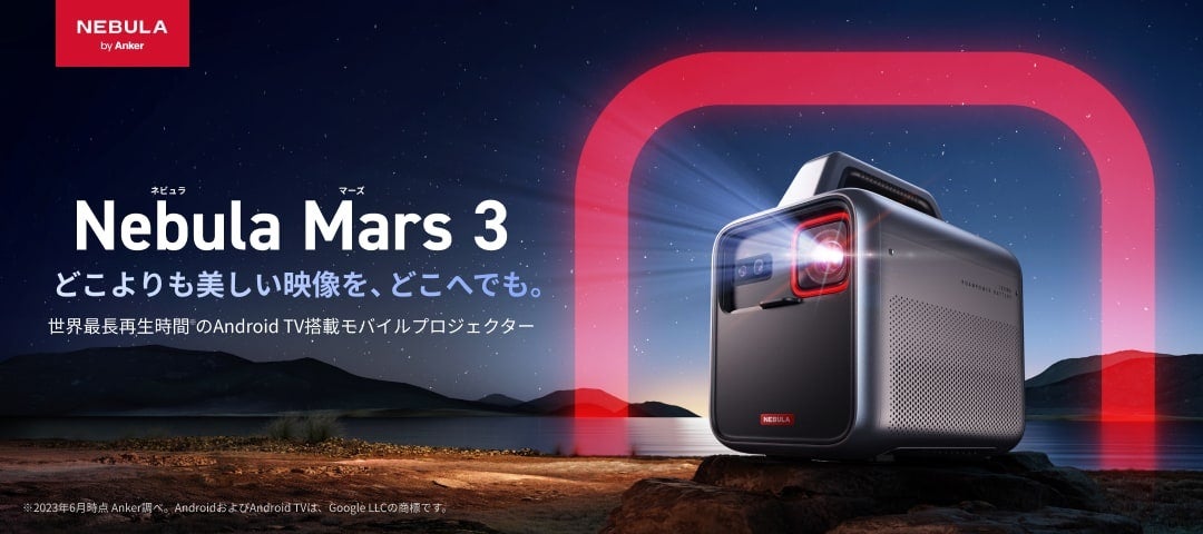 米国・日本・欧州を中心にデジタル関連製品でトップクラスの販売実績を誇るAnkerグループの日本法人、アンカー・ジャパン株式会社 (本社:東京都千代田区、代表取締役CEO:猿渡歩) は、スマートプロジェクターブランド「Nebula (ネビュラ) 」において、モバイルプロジェクター「Nebula Mars 3」を2023年7月10日(月)よりAnker Japan 公式サイト(製品ページ:https://www.ankerjapan.com/products/d2333)、総合オンラインストアAmazon.co.jp(製品ページ:https://www.amazon.co.jp/dp/B0BZWB32GD)、楽天市場(製品ページ:https://item.rakuten.co.jp/anker/d2333/)および一部家電量販店等にて予約販売を開始致します。また、8月8日(火)より同販路にて一般販売を開始致します。