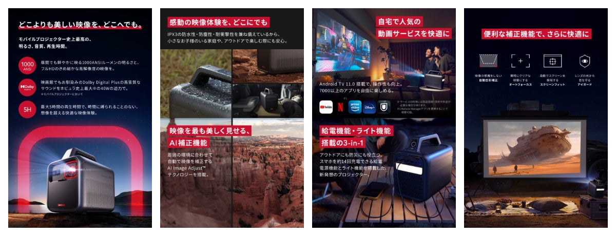 さらにNebulaで初となる様々な機能を採用しており、スマートフォンを約14回フル充電できる給電機能や、暗い場所での本体の投影セッティングに最適なライトの搭載、急な雨でも安心のIPX3への対応や耐衝撃性を高めることで、アウトドア等の屋外でも安心してお使いいただけます。また、どのような環境でも簡単にセットアップできる使いやすさも魅力で、垂直および水平方向への自動台形補正や高速オートフォーカスに対応している他、AIが周囲の環境に合わせて最も映像を美しく投影するための輝度や色味を調整する「AI Image Adjust™」も初搭載しました。