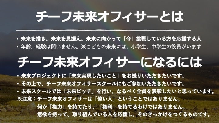 実際にどんなことをしていくかは、チーフ未来オフィサーであるこども達(https://prtimes.jp/main/html/rd/p/000000326.000018590.html)と共に形作ってまいります。共創、ボトムアップをとても大切にしており、ラジオ、会議、カンファレンスなど、皆さんとコラボレーションを大切にしていきたいと思います。