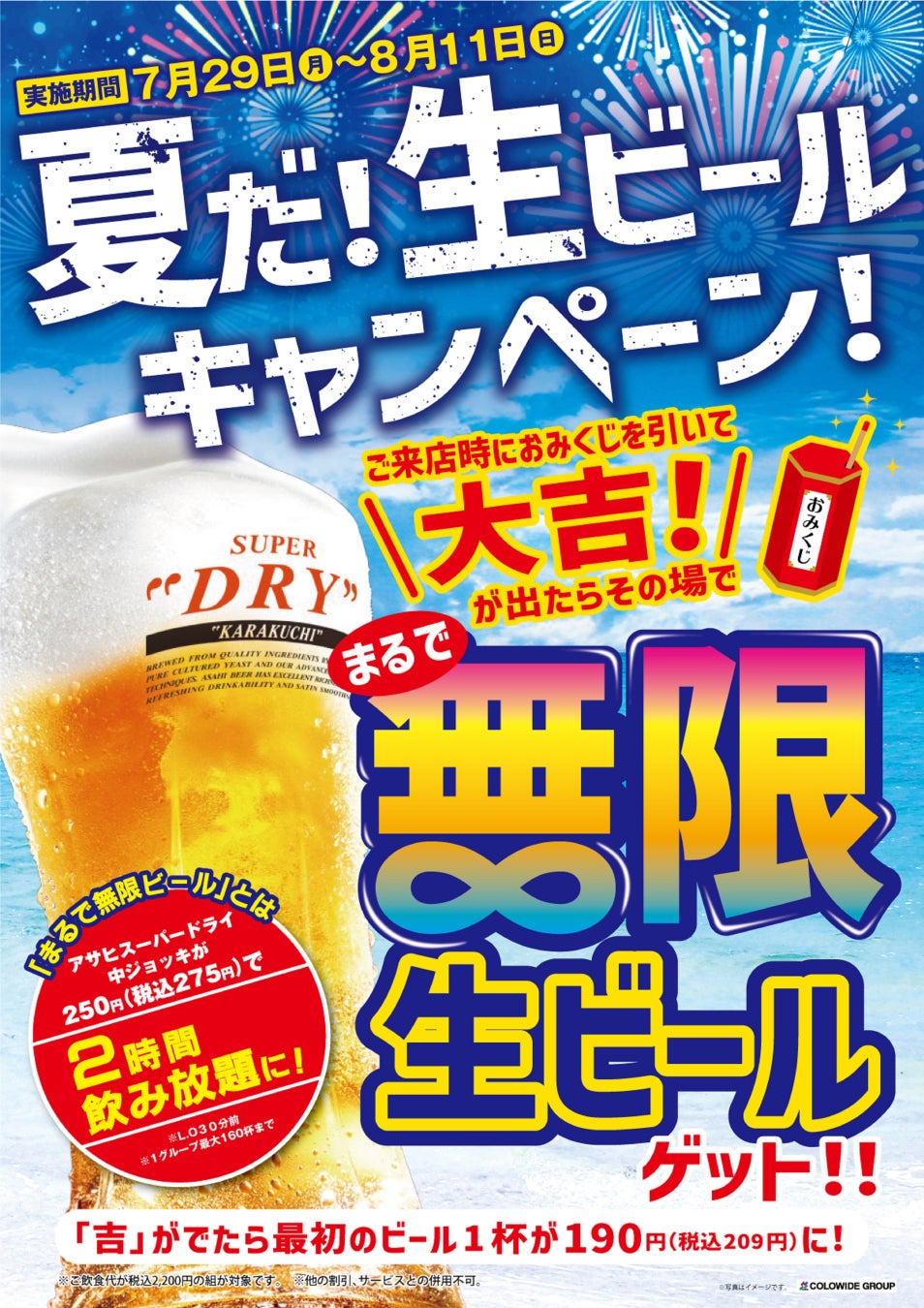 内容:ご来店時にくじ引きで大吉が出たら生ビール1杯分の価格で2時間(ラストオーダー30分前)飲み放題。吉が出たら生ビールが最初の1杯190円(税込209円)