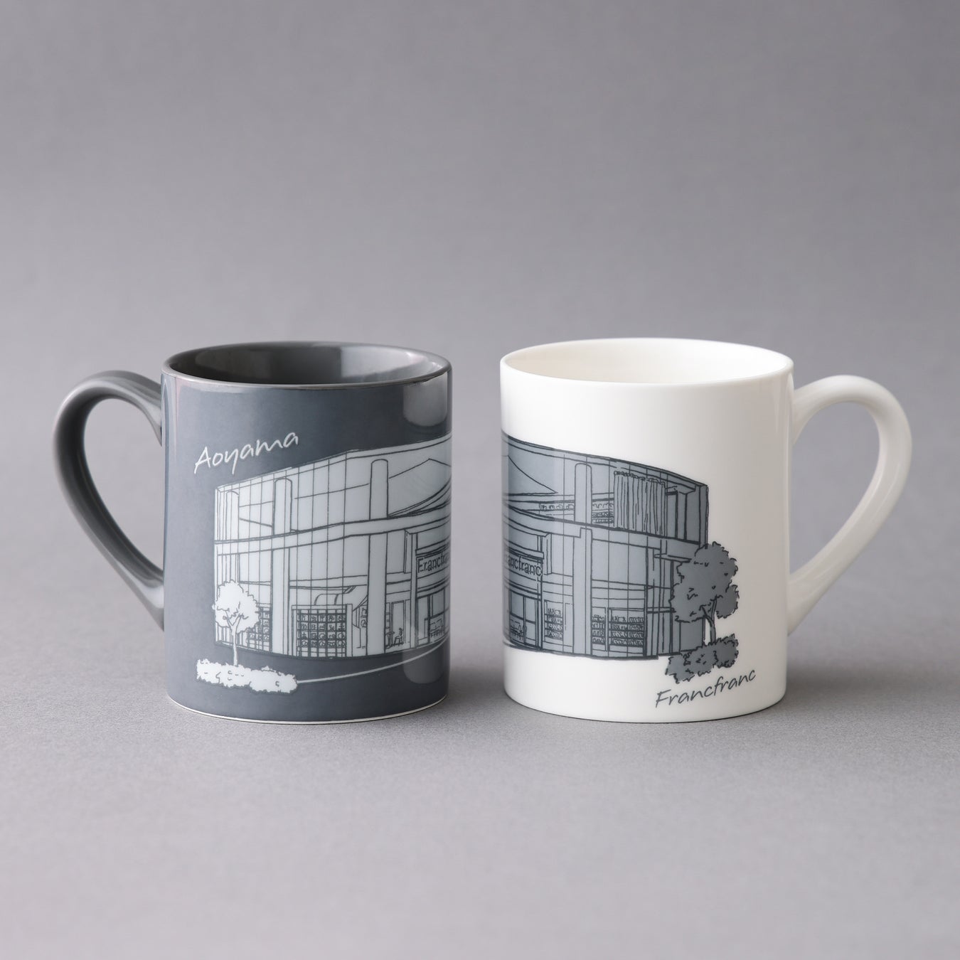 各店舗の外観をモチーフにした、リニューアル記念の限定マグカップです。Francfrancのデザイナーが手描きで仕上げた特別なイラストをあしらっています。各店舗の2カラーをセットにしても、青山店と新宿店の各色を組み合わせても映える上品なカラー展開です。