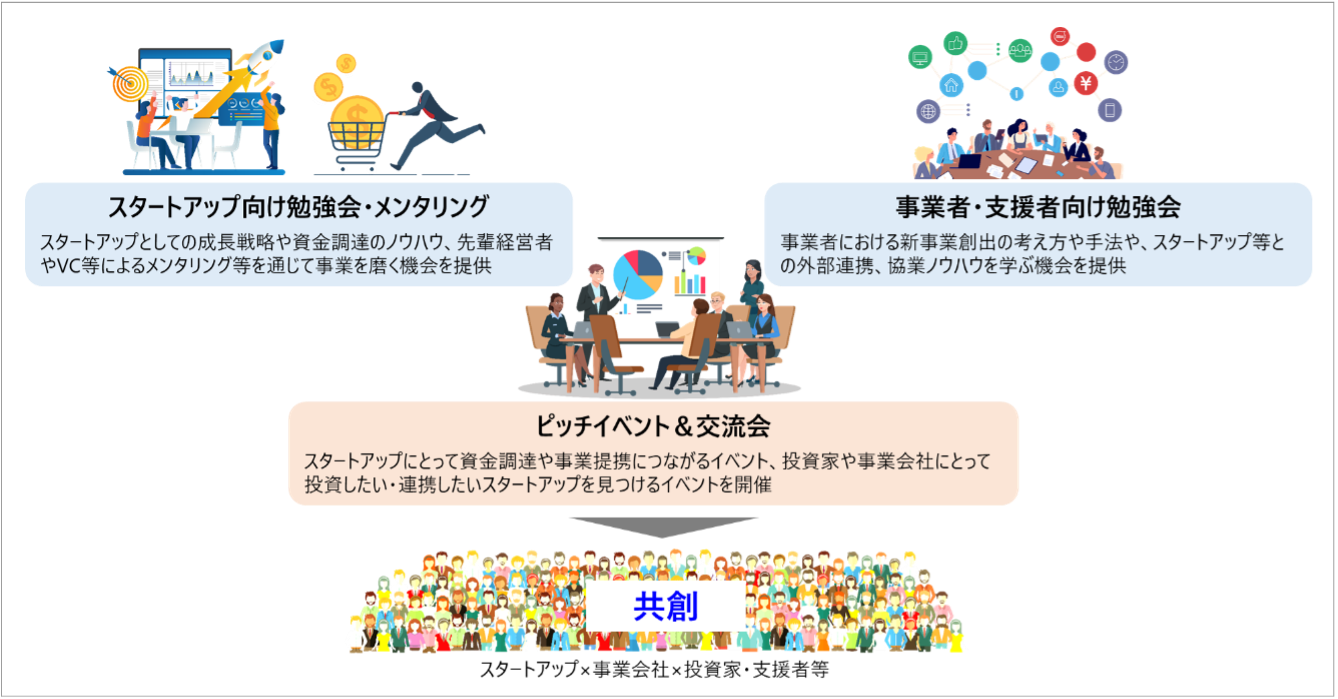 ・スタートアップが資金調達や事業者との共創を実現する目的で、サービスを紹介するイベントや参加者同士の交流会を開催