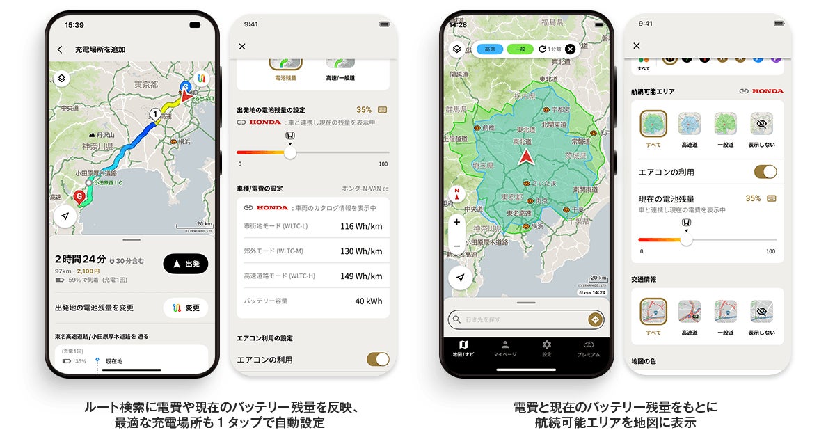 本連携では、『EVカーナビ by NAVITIME』のアプリ内にて「Honda Total Care」アカウントでログインすることで、車両のバッテリー残量を直接車から取得できるようになり、都度バッテリー残量を手入力することなく、より手軽でシームレスに、正確なバッテリー残量に基づいたEV専用カーナビの機能をご利用になれます。
