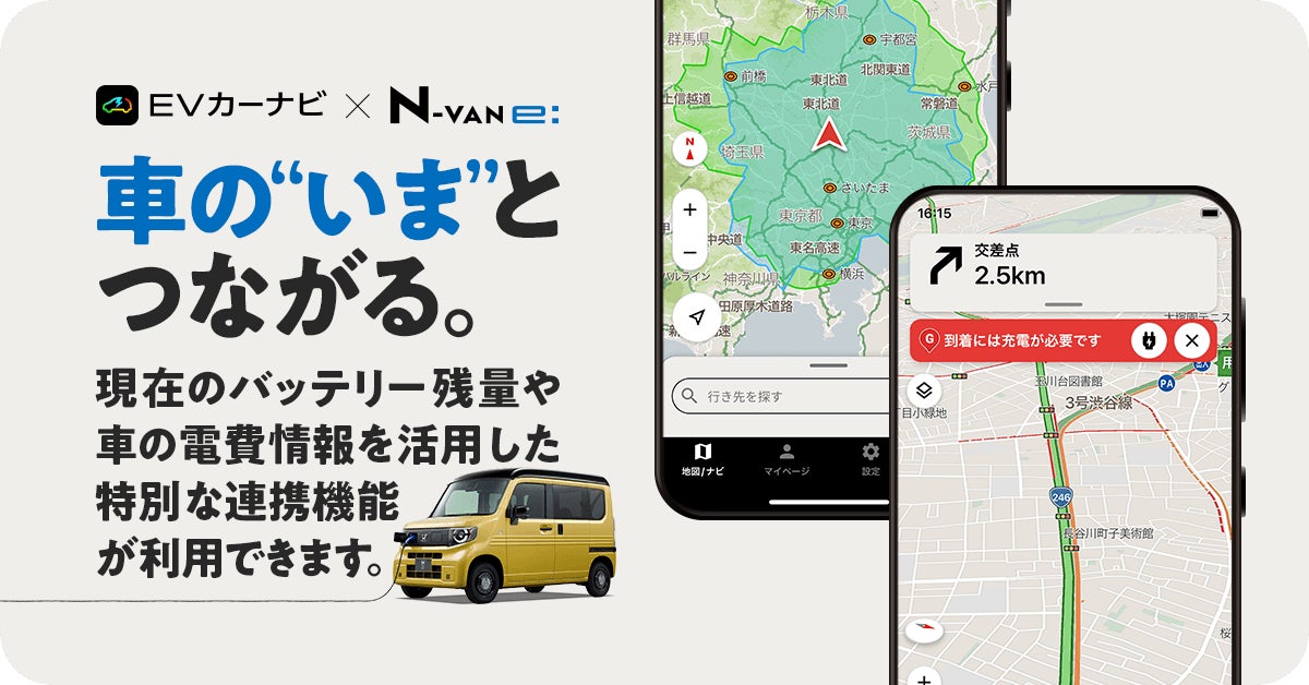 『EVカーナビ by NAVITIME』、バッテリー残量を考慮したルート検索など、Hondaの軽商用EV「N-VAN e:」との連携機能提供開始