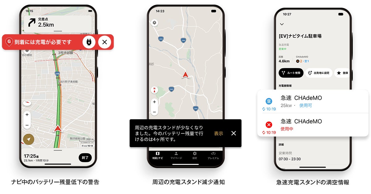 ナビゲーションを利用していない時にも発動するので、あらかじめ充電場所を計画していない場合でも安心です。