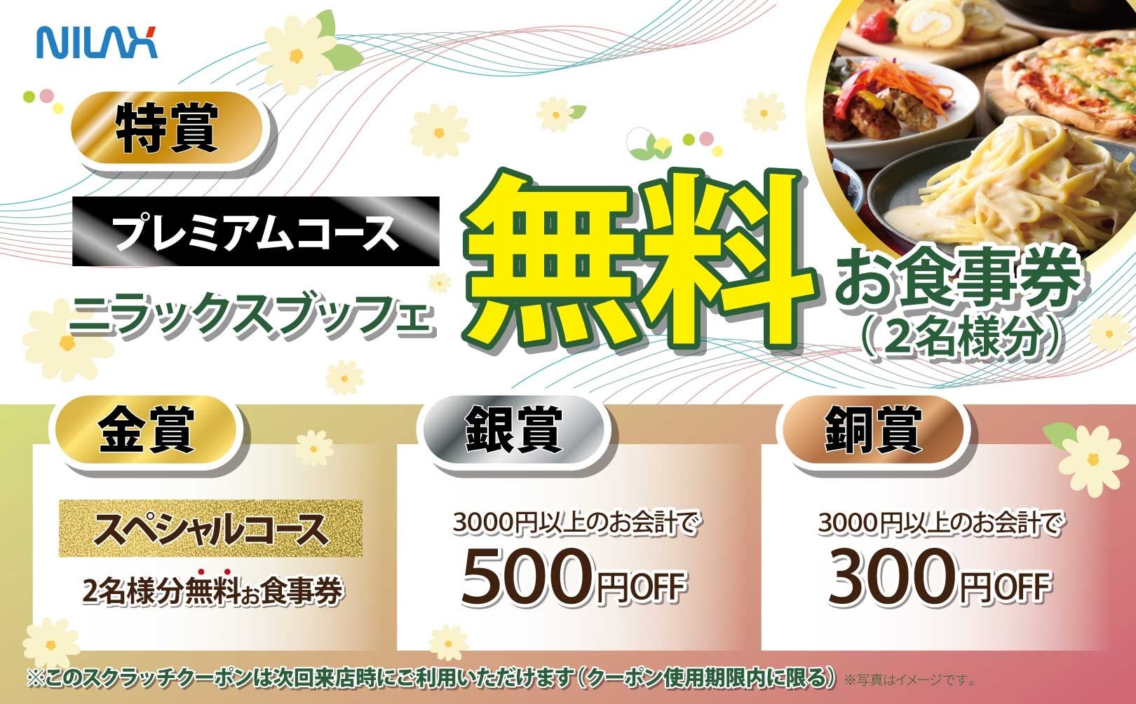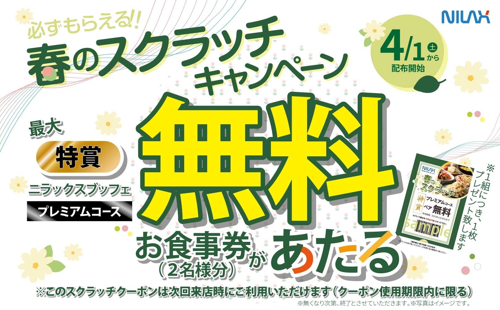【最大で2名様分が“無料”になるお食事券が当たる!】バラエティー豊かな食べ放題の“ニラックスブッフェ”47店舗にて『春のスクラッチキャンペーン』を開催いたします!