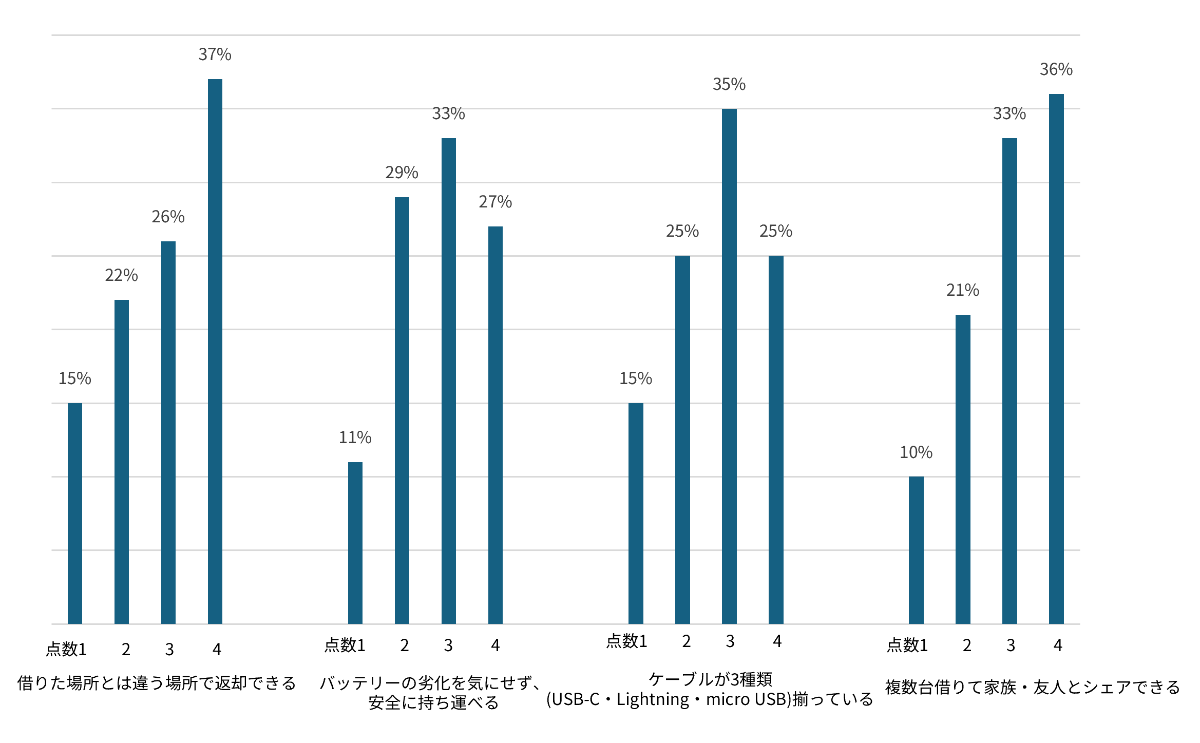 レンタルサービスに最も求められるのは「借りた場所とは違う場所で返却できる」機能(71%が重視)。旅行中の自由な行動を保証し、返却場所を気にせず移動できることが最大の価値。加えて「ケーブルが3種類完備」(62%)により、ケーブル忘れのリスクもなく、家族や友人とも柔軟にシェアできる利便性が、所有型にはない圧倒的な優位性となります。