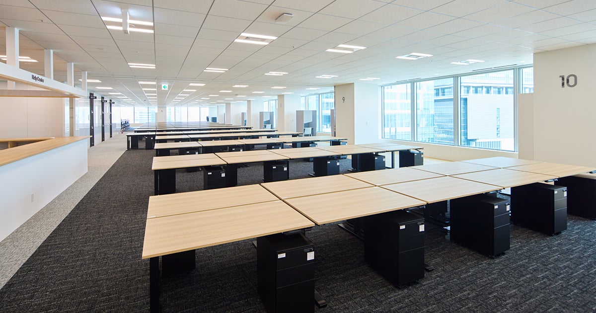 部署ごとの隔たりを無くし、コミュニケーションをとりやすい執務エリアを実現。19階、20階という眺望の良さを活かし、どの席からも外を見ることができるような作りになっています。