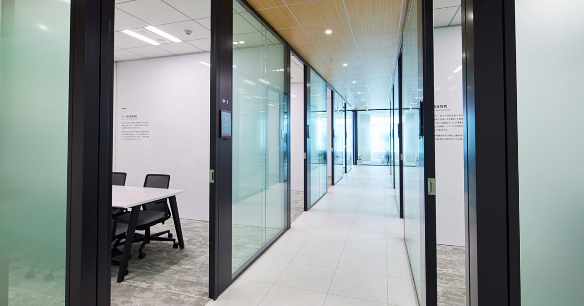 ゲストエリアには、目的に応じて大小様々な会議室を設置しました。会議室の名称を事業にちなんで、契約書において当事者を表す「甲・乙・丙」をエリアごとの会議室名称にしています。