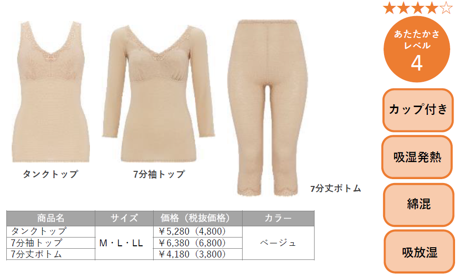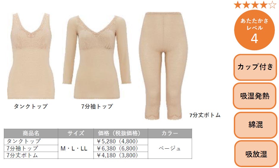 1枚で着られる便利なカップ付きインナー2型と、同素材の7分丈ボトムのシリーズです。特長は、ふんわりソフトな肌ざわりと、ラクな着けごこち。トップは背中部分が二重仕立てになっているので、あたたかいだけでなく、カップのフィット感も安定させてます(ボトムは腰部分が二重仕立てです)。身生地には吸湿発熱性にすぐれた素材を使用。吸放湿性もあるため、ムレを軽減します。