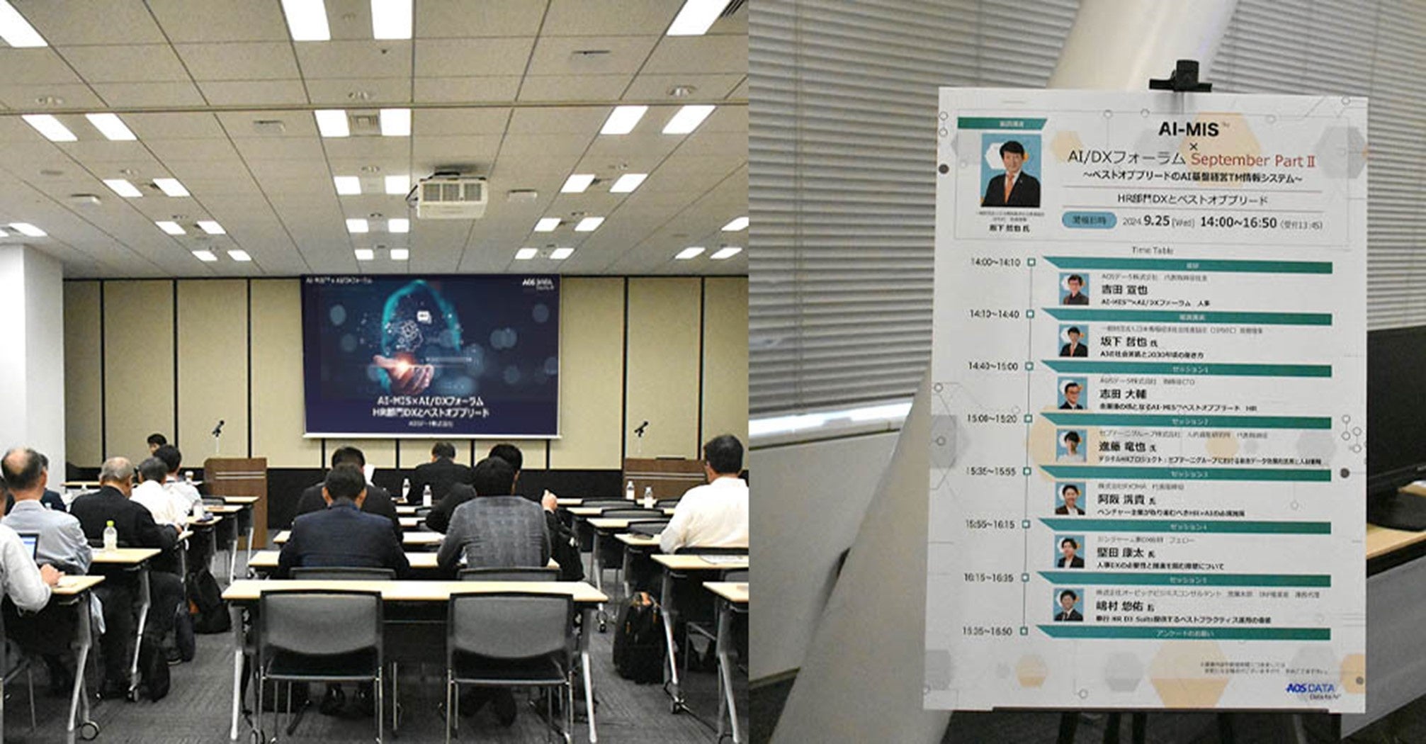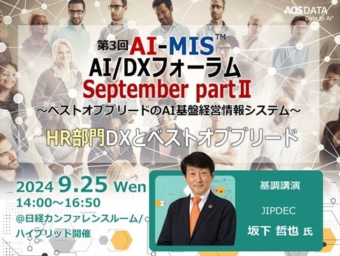 日本のDX推進の課題解決に貢献するため、AOSデータ社は、各業界で活躍されているベンダー様と共に協力しながらAI基盤の経営統合管理システムAI-MISの普及に推進しており、2024年9月25日に「AI-MIS×AI/DXフォーラム September part Ⅱ」 ~AI基盤経営情報システム HR(人事)部門DXとベストオブブリード〜というテーマで日経ホール&カンファレンスルームにてフォーラムを開催し、多くのお客様にご参加いただきました。