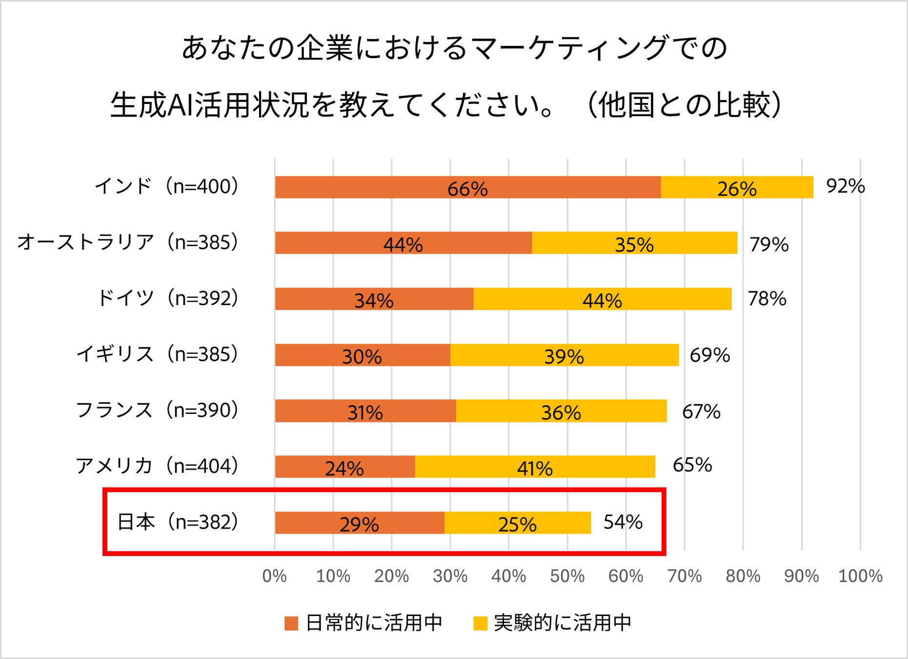 日本のマーケターにおける生成AIの活用状況に関する調査結果によると、回答者の約半数(54%)が生成AIを活用していることがわかりました(日常的に活用中29%、実験的に活用中25%)。この数値は他国平均の約75%と比較すると低い水準にとどまっています。例えば、インドでは92%、オーストラリアでは79%のマーケターが生成AIを活用しています(図1)。