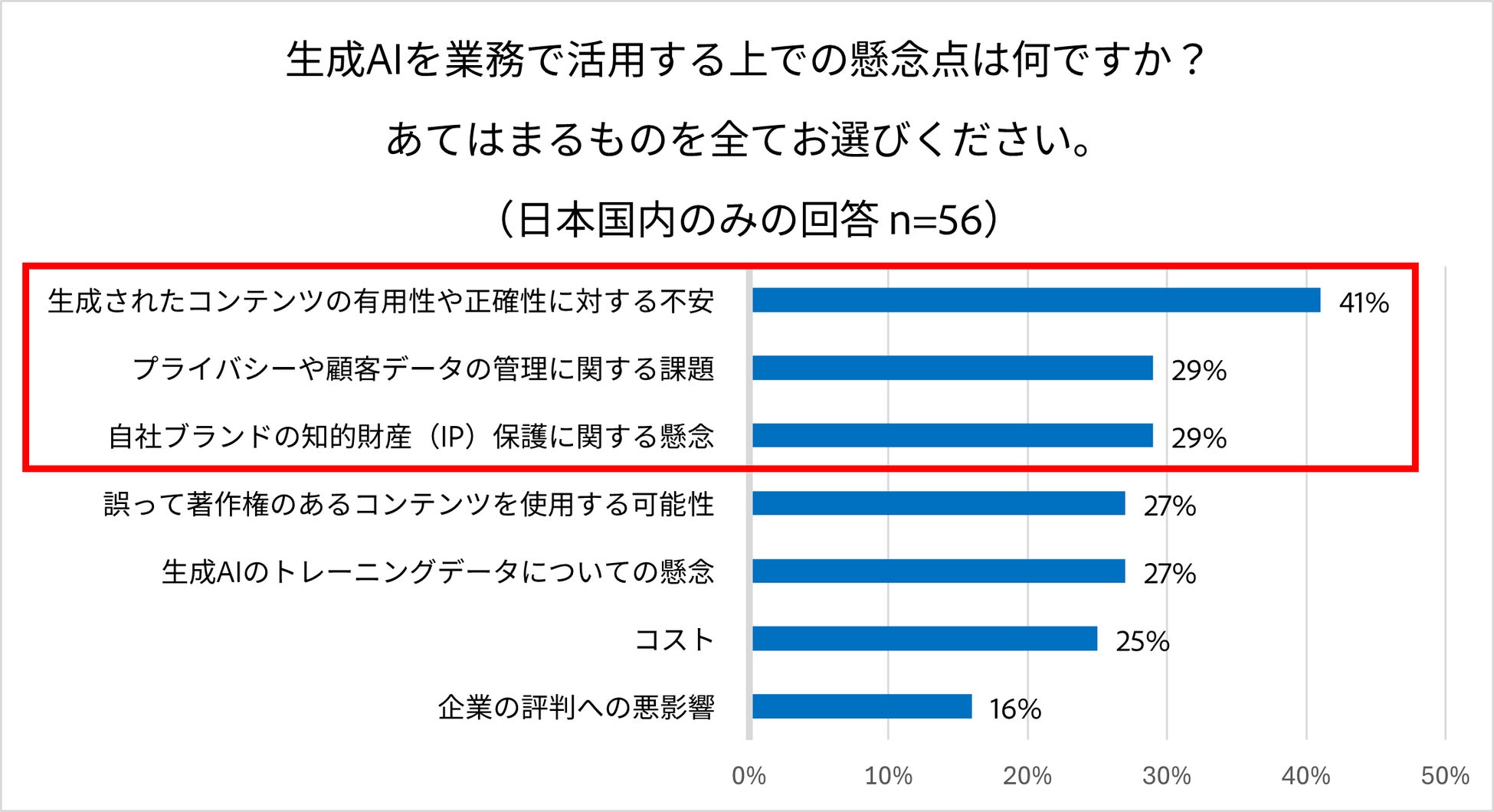 現在生成AIを業務で活用しておらず、活用することに不安を感じている日本の回答者に懸念点を聞いたところ、次の3つが挙げられました(図4)。生成AIが作成したコンテンツの有用性や正確性(41%)、プライバシーや顧客データの管理(29%)、自社ブランドの知的財産(IP)保護(29%)。