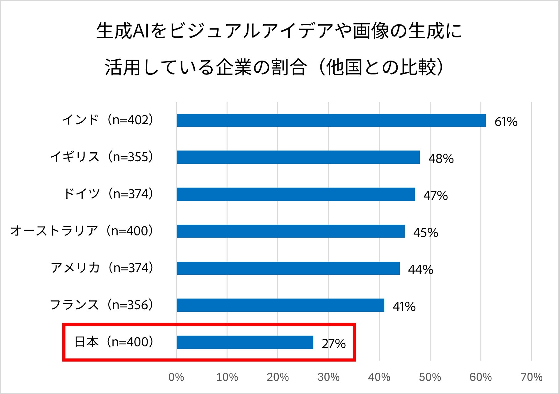 日本企業の中で生成AIをビジュアルアイデアや画像の生成に活用している企業は27%にとどまった一方で、インドでは61%、オーストラリアでは45%の企業がクリエイティブ作成に生成AIを活用していることがわかりました(図3)。