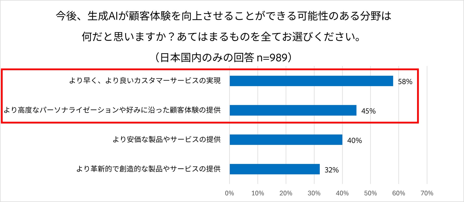 企業の生成AI活用に対して、消費者の約半数(52%)が生成AIの活用は有用であると回答しています。今後、生成AIが顧客体験を向上させることができる可能性のある分野として、58%の消費者が、より早く、より良いカスタマーサービスの実現に有効であると考えていることが明らかになりました。続けて、45%の消費者が、より高度なパーソナライゼーションや好みに沿った顧客体験の提供に役立つと回答しています(図5)。