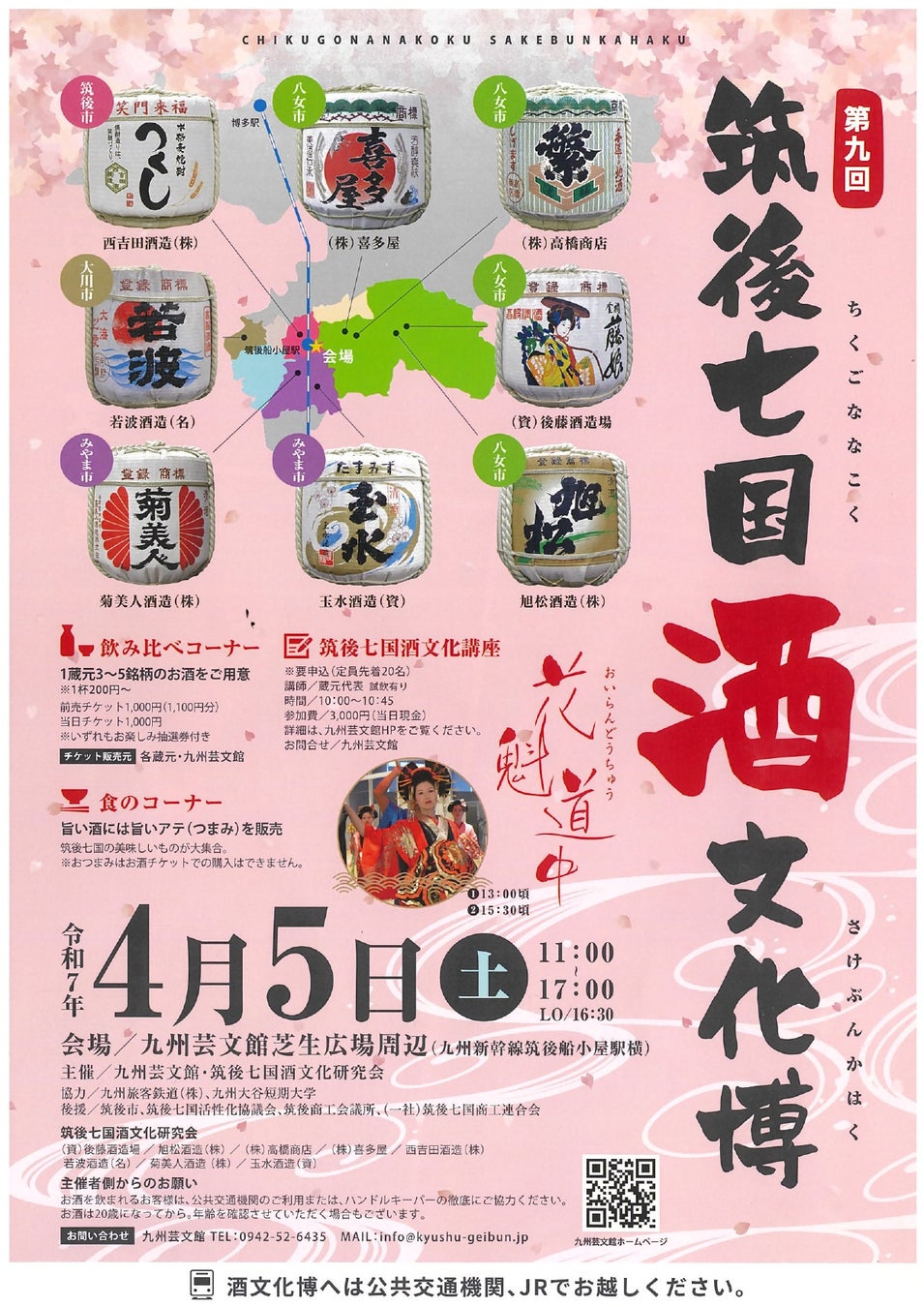 矢部川流域の8つの酒蔵(後藤酒造場・旭松酒造・高橋商店・喜多屋・西吉田酒造・若波酒造・菊美人・玉水酒造)で構成される筑後七国酒文化研究会が、新酒が勢ぞろいした4月に九州芸文館芝生広場に大集結!!