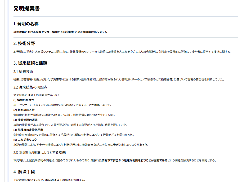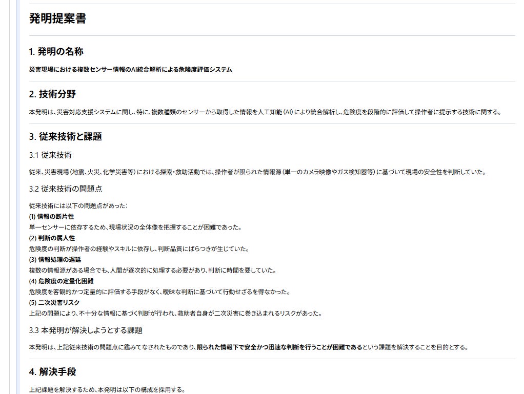 これらの内容を発明提案書として整理することで、災害対応という高度な安全性が求められる分野においても、研究開発構想を特許出願を見据えた形で具体化することが可能となった。