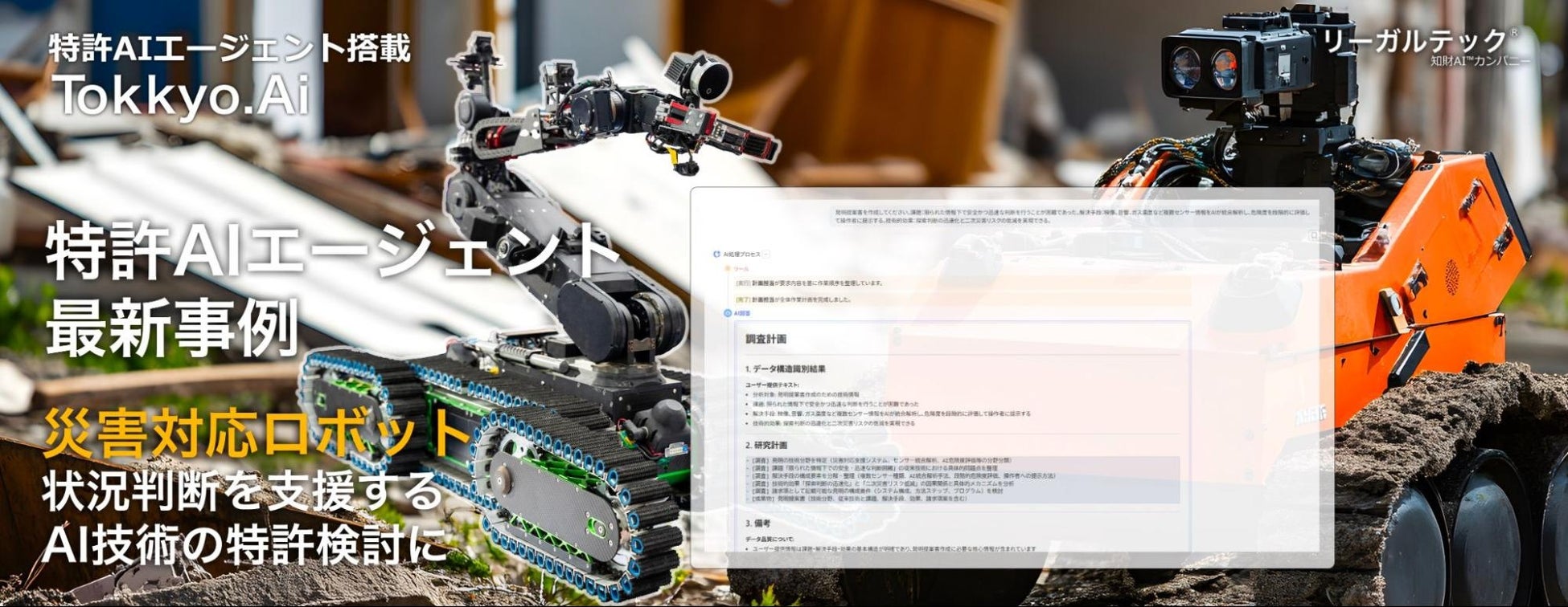リーガルテック株式会社(本社:東京都港区、代表取締役社長:平井智之)は、災害現場で使用される探索ロボットの状況判断支援AI技術に関する特許検討において、同社が提供する特許支援AIプラットフォーム「MyTokkyo.Ai」が活用されたことを発表する。