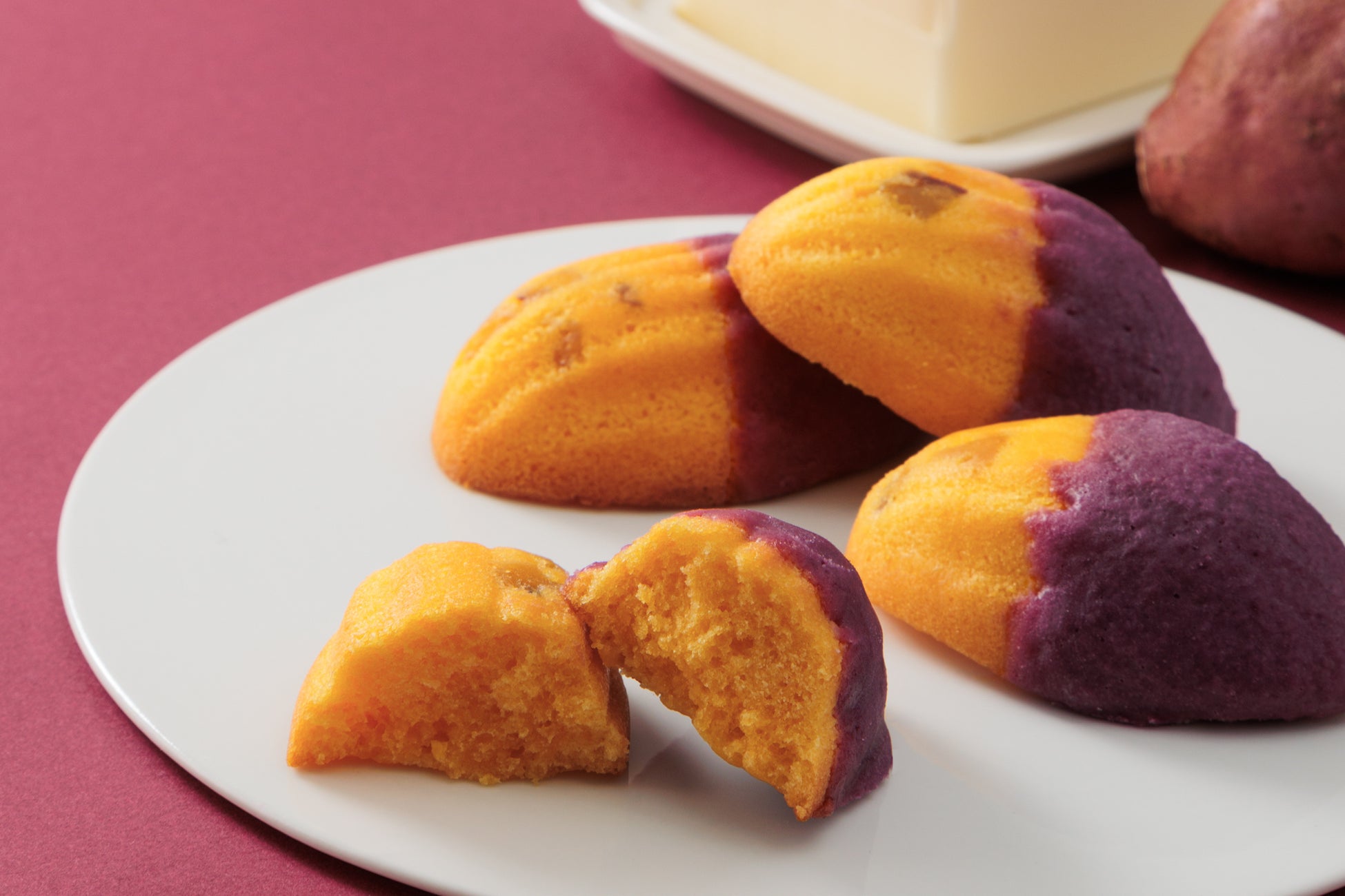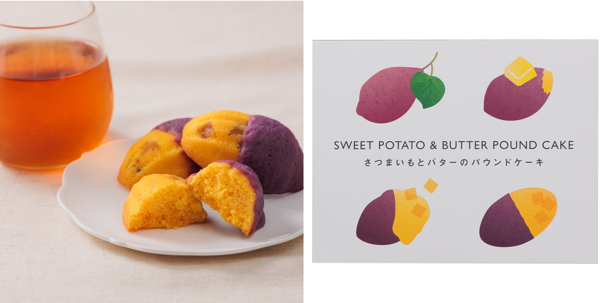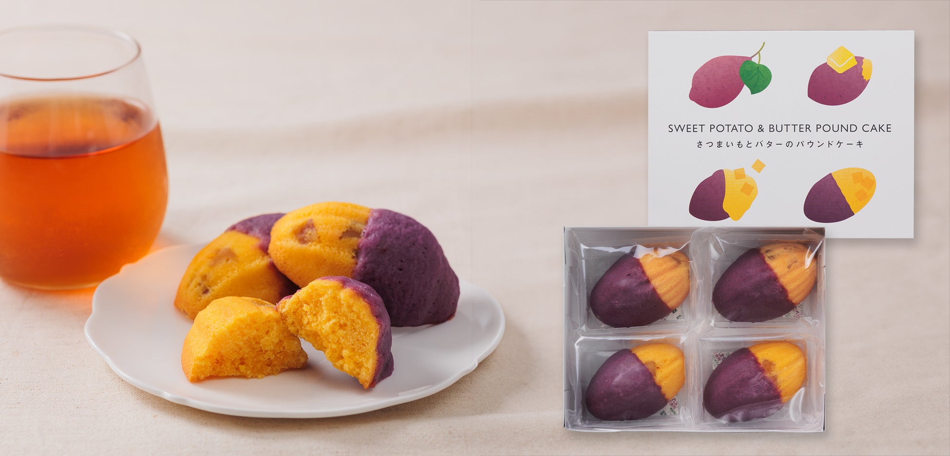 この度発売する「さつまいもとバターのパウンドケーキ」は、見た目も味わいもまるで焼き芋のようなかわいいパウンドケーキです。たっぷりのバター(生地中20%使用)と、さつまいもソース入りの生地を風味豊かに焼き上げた黄色のパウンドケーキの中に、焼き芋の蜜を表現するため、甘味が強くホクホクとした食感が特徴の鳴門金時ダイスをごろっと入れました。さらに焼き芋の皮をイメージした紫色の部分は、1つ1つ手作業でシュガーコーティングをしており、1個で2つの食感を味わえる贅沢な一品に焼き上げました。