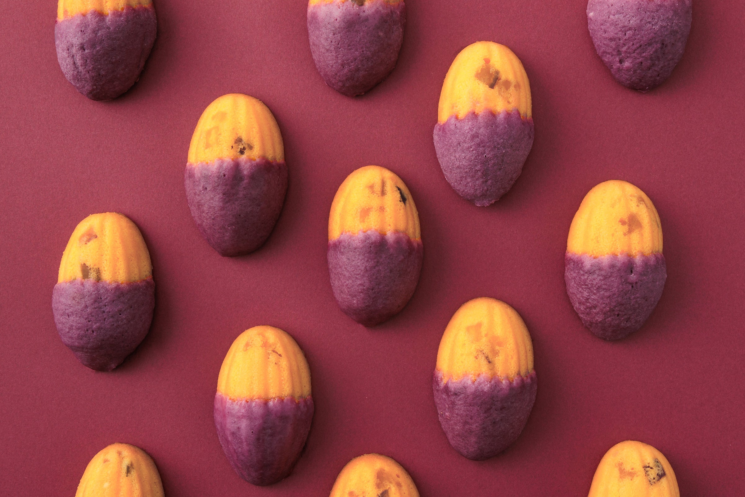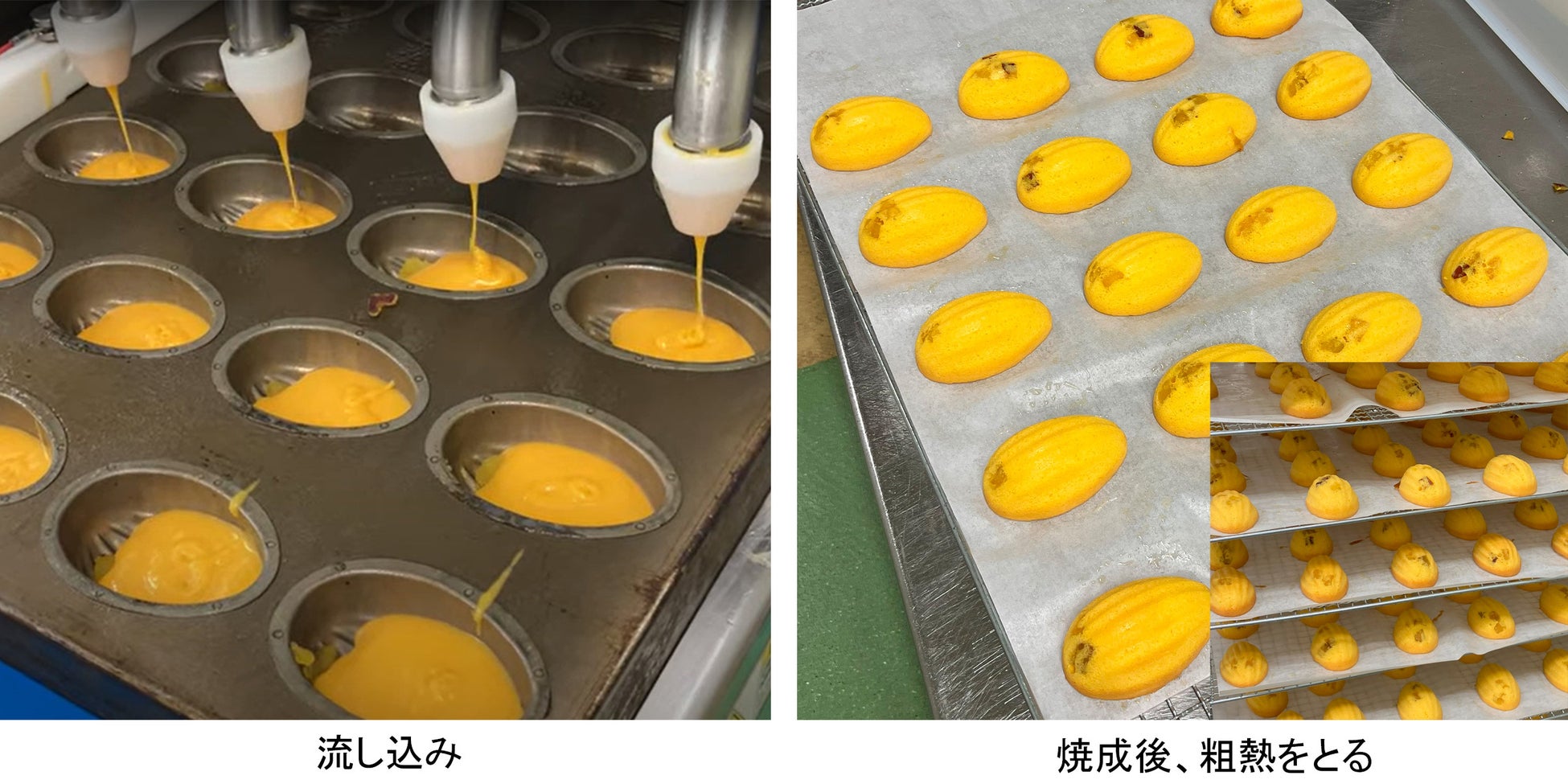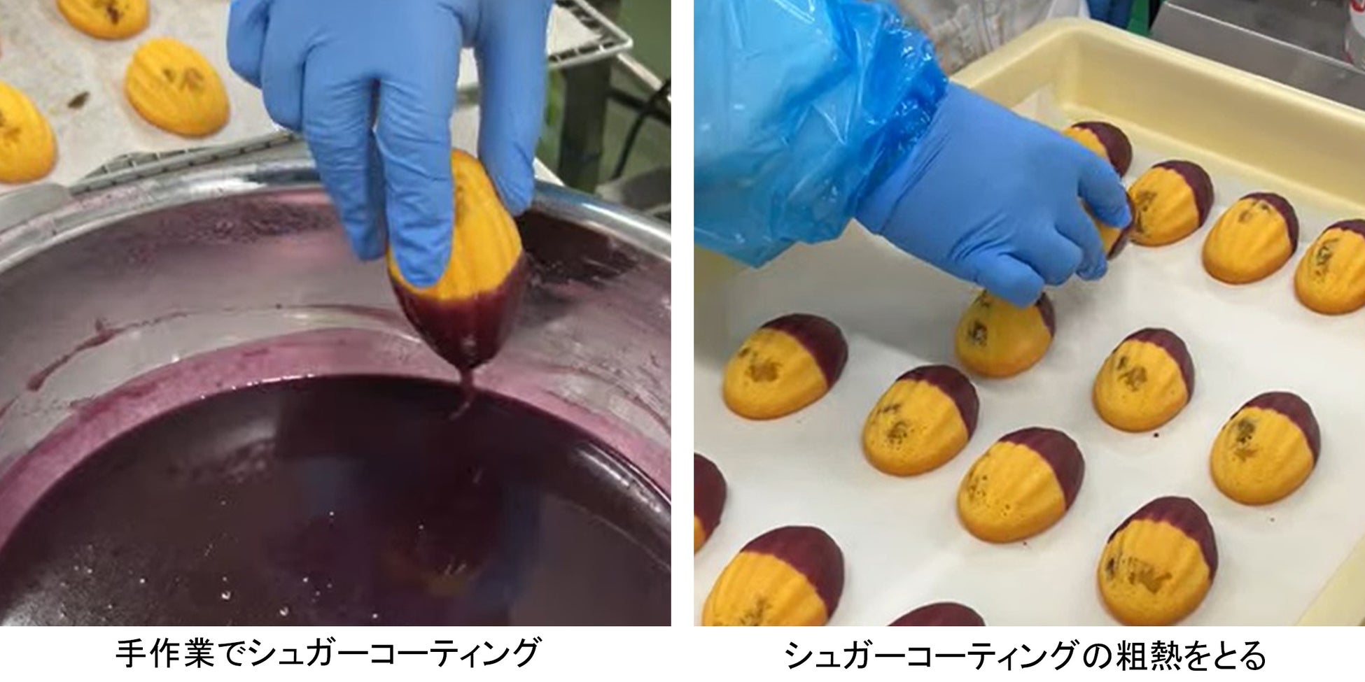 この度発売する「さつまいもとバターのパウンドケーキ」は、見た目も味わいもまるで焼き芋のようなかわいいパウンドケーキです。たっぷりのバター(生地中20%使用)と、さつまいもソース入りの生地を風味豊かに焼き上げた黄色のパウンドケーキの中に、焼き芋の蜜を表現するため、甘味が強くホクホクとした食感が特徴の鳴門金時ダイスをごろっと入れました。さらに焼き芋の皮をイメージした紫色の部分は、1つ1つ手作業でシュガーコーティングをしており、1個で2つの食感を味わえる贅沢な一品に焼き上げました。