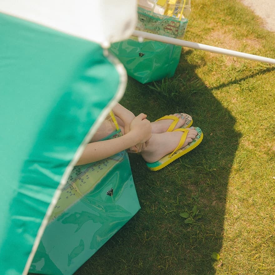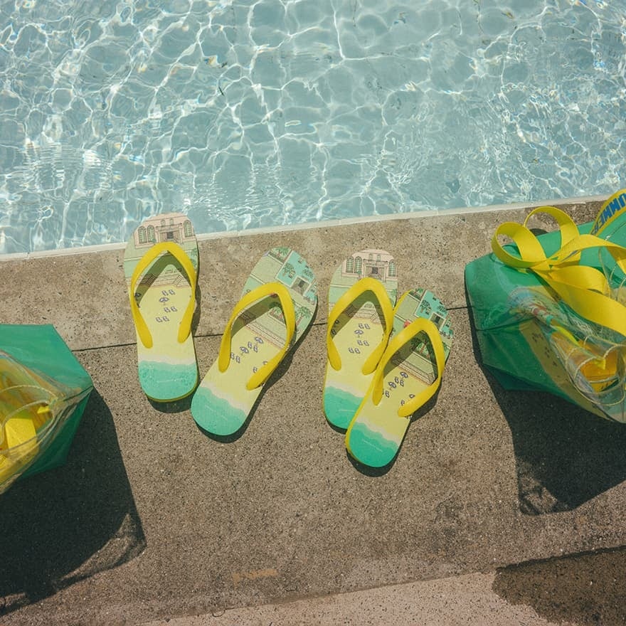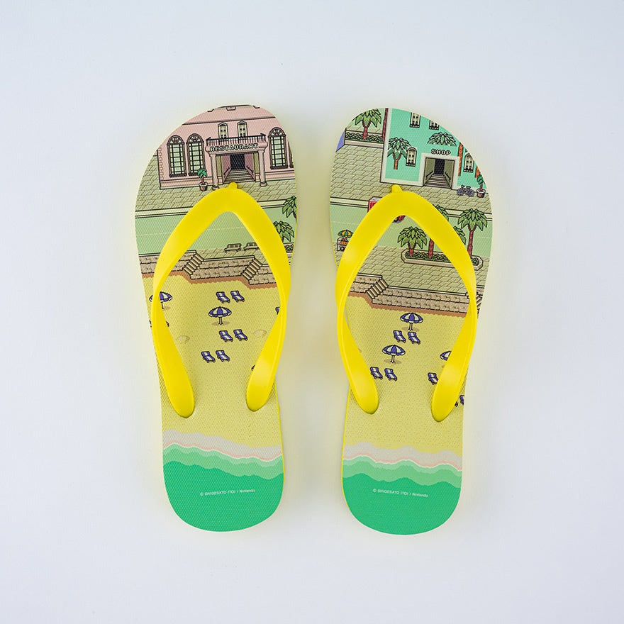 『MOTHER2』のゲーム中盤で訪れるおしゃれな避暑地大きく配置したビーチサンダルです。『MOTHER2』独特のエッジと発色を存分に活かしたデザインで、ボディや鼻緒の色もマップの色から選ばれています。ボディの素材はラバー(天然ゴム)のため、やわらかく、ふわっとした履き心地です。海やプールに行くときに使うのはもちろん、ルームシューズ、飛行機やホテルなど旅先でもたのしく使っていただけます。[サイズ]M(23-25cm)、L(25-27cm)