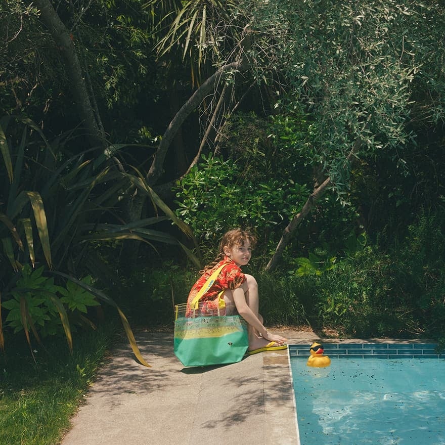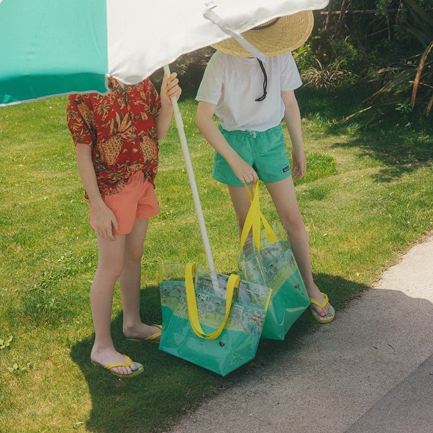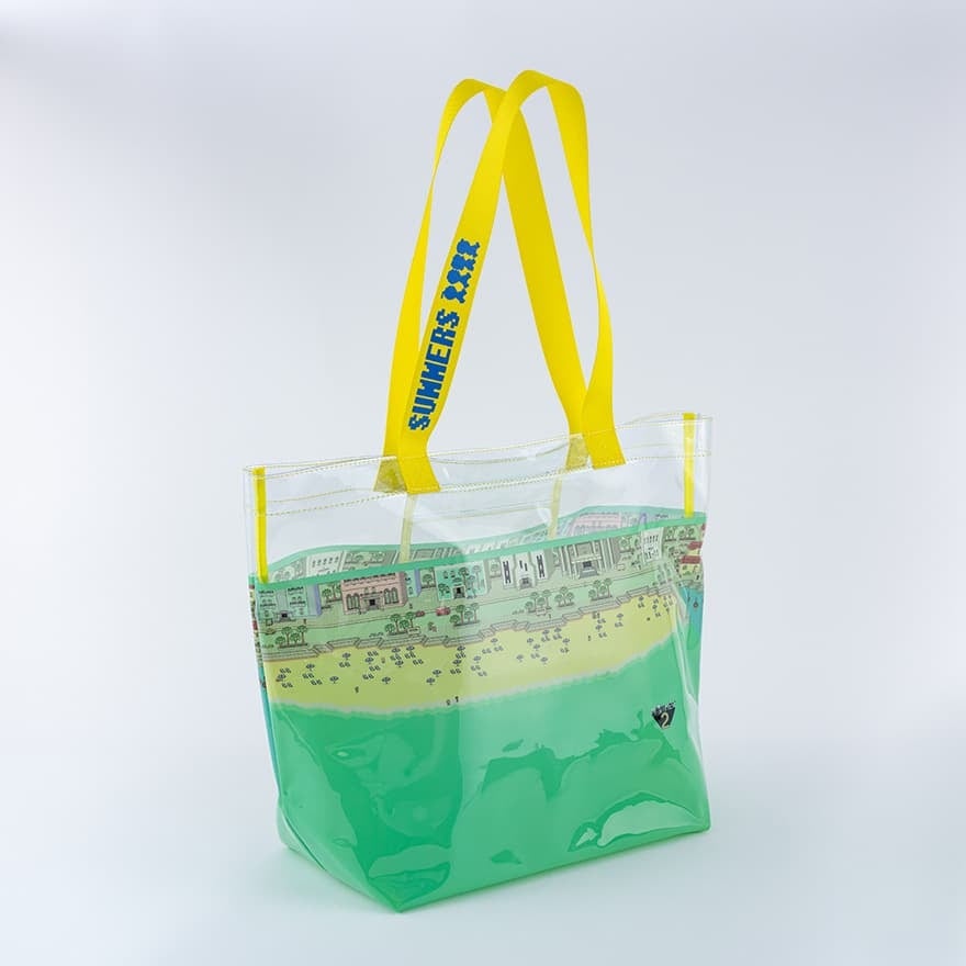 「サマーズ」のマップを大きく配置したビーチバッグです。ネス、ポーラ、ジェフ、プーのシルエットがプリントされた持ち手は、肩掛けもできるよう少し長めに。鍵やスマホが入る内ポケットがついています。防水性のあるPVC素材なので、濡れた水着やタオル、トレーニングウェアをそのまま入れられます。プールやビーチ、雨の日にも気兼ねなく使えます。[サイズ]横495×高さ357×マチ177mm