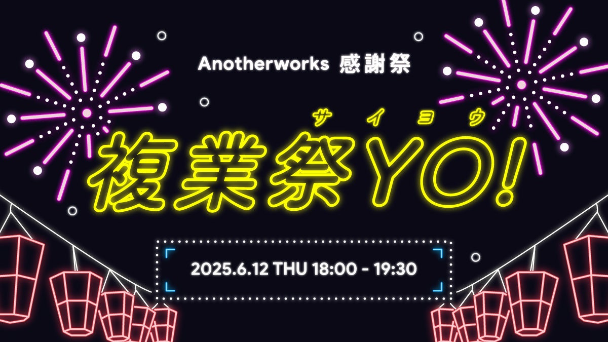 2025年5月7日に創業6周年を迎えたことから、ステークホルダーの皆様への感謝の気持ちをお伝えすべく「Another works感謝祭~複業祭YO!~」を開催することとなりました。今回の感謝祭では、AI活用による複業の可能性がテーマになります。AIを積極的に活用して複業人材の採用や事業推進を成功させている先進的な企業をゲストに招き、具体的なノウハウや最新の活用術を共有します。また、参加者同士が気軽に交流できるネットワーキングの場も提供いたします。