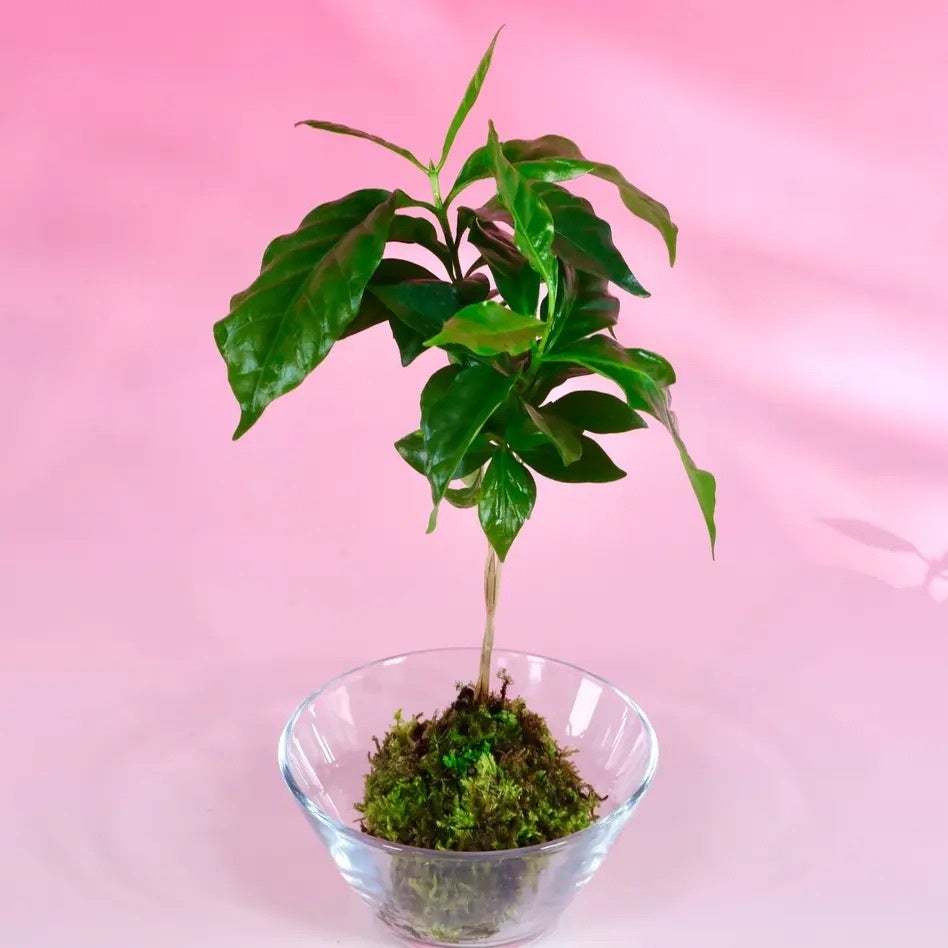 カフェや美容院でよく見かける憧れの観葉植物コーヒーの木と、高野山麓で採取しました天然這苔を使用した苔玉です。ミニ観葉植物としてお楽しみ頂けます。鉢植えにして2〜3年で花が咲き、実がなります。