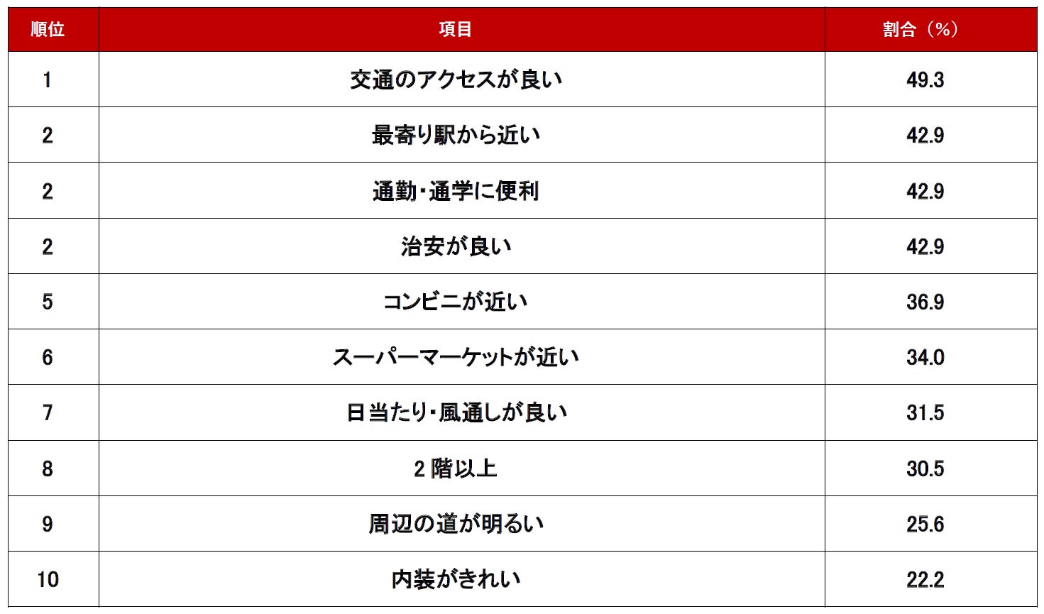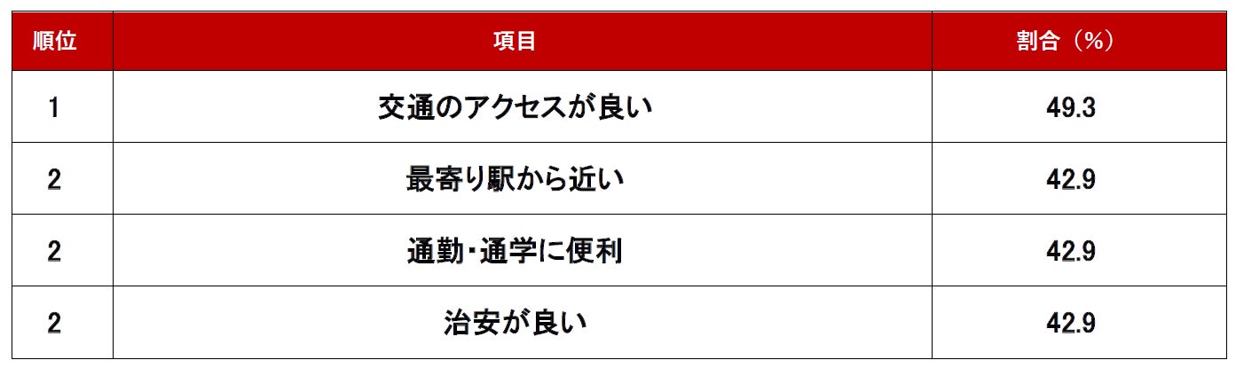 同率の2位には「治安が良い」がランクインし、「都市部ではセキュリティー面が重要」といったコメントが寄せられました。