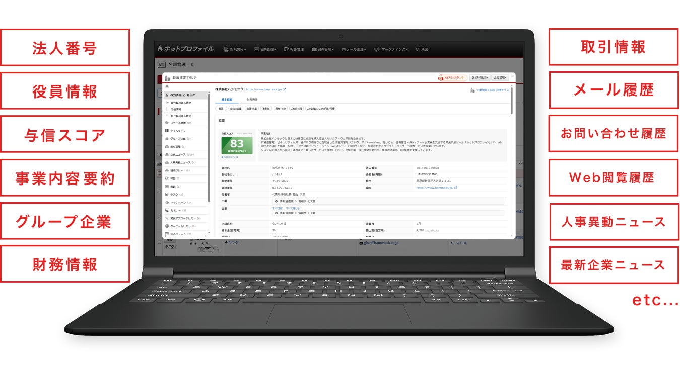 株式会社ハンモック(本社:東京都新宿区、代表取締役社長:若山 大典、証券コード:173A、以下「ハンモック」)は、クラウド型名刺管理・営業支援ツール「ホットプロファイル」の企業データベースに、グループ企業情報・財務情報・取引先情報・役員/株主情報など、営業活動に直結する情報の拡充を完了したことをお知らせいたします。