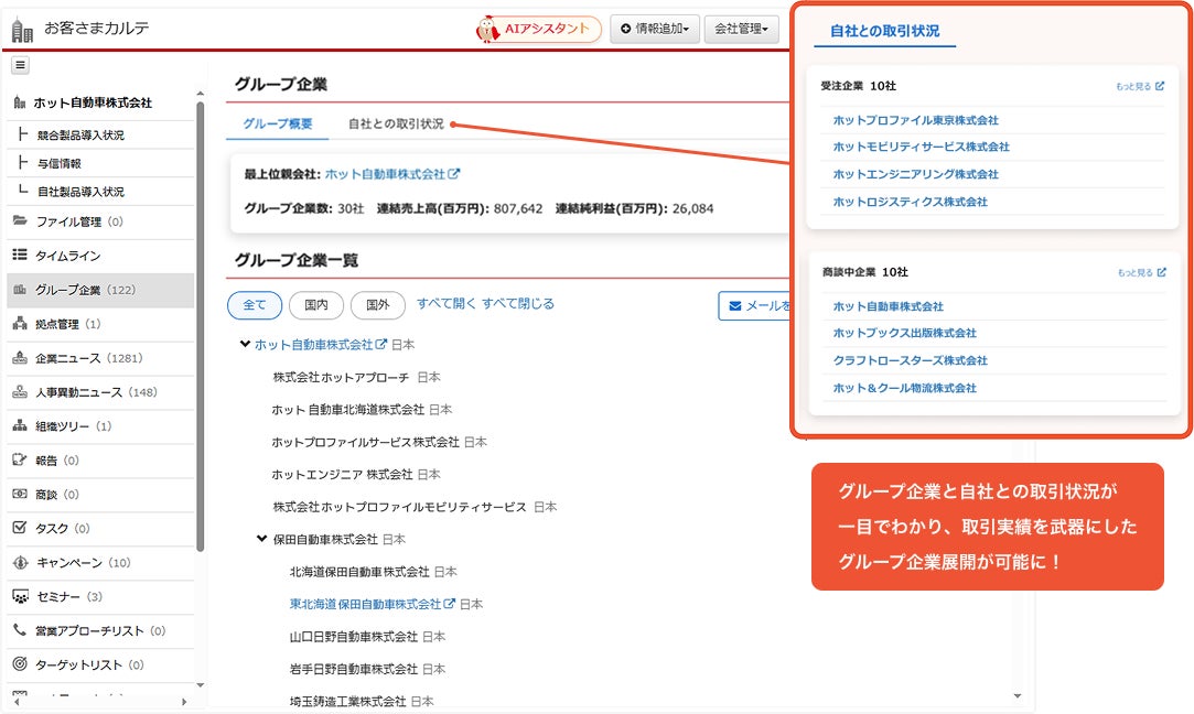 これまで個別に調べる必要があった顧客のグループ企業や主要取引先の情報も、一目で把握できます。加えて、自社との取引状況も確認できるため、どの企業に優先的にアプローチすべきかが明確になります。