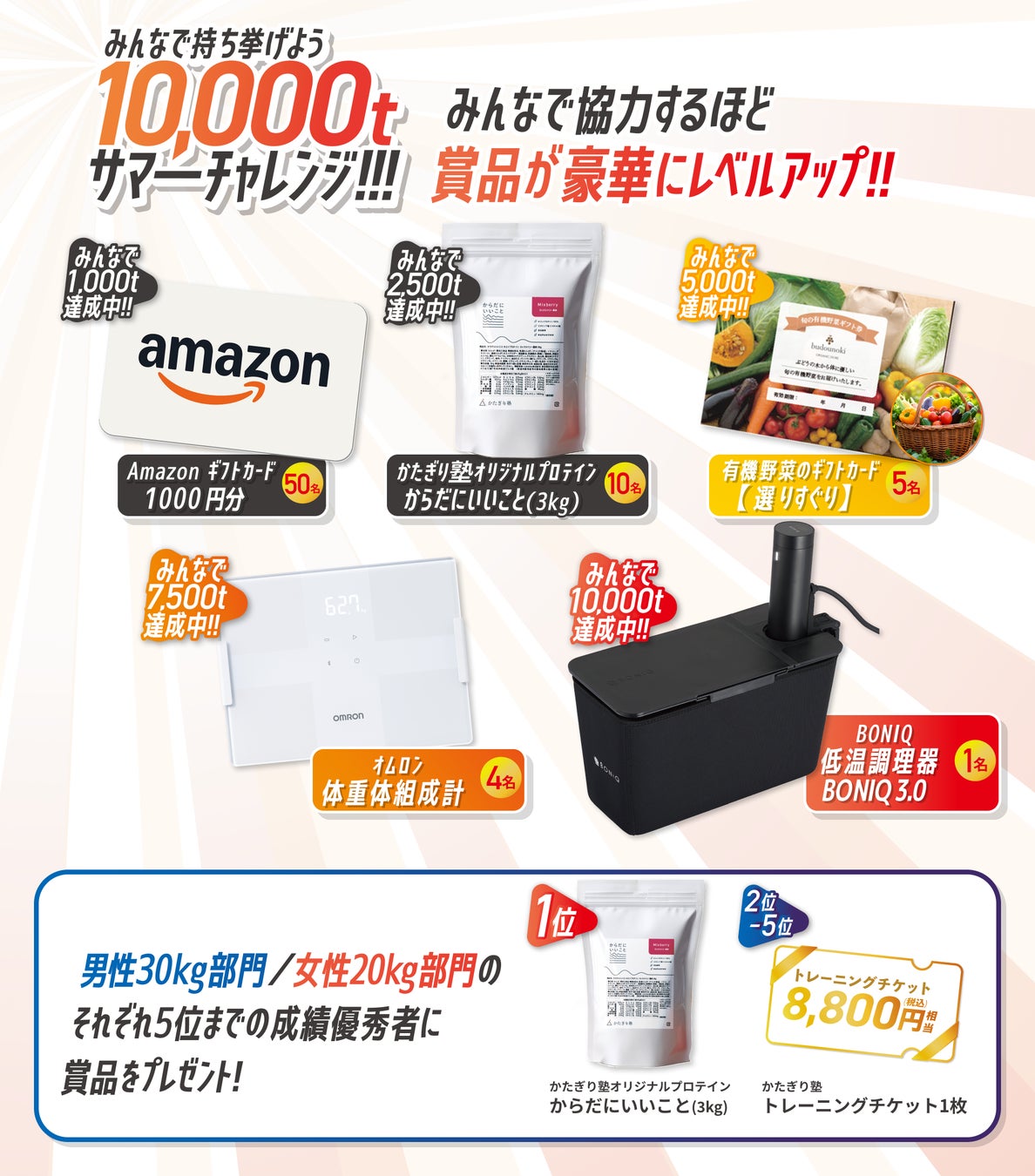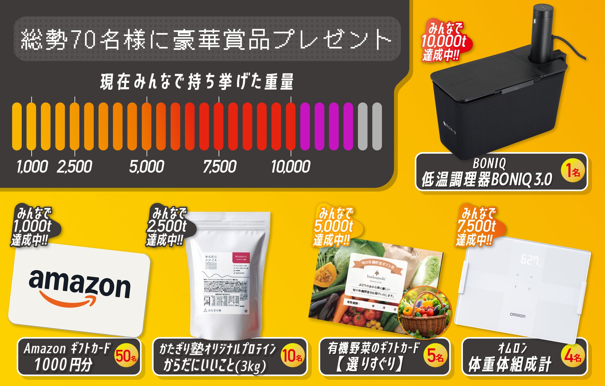 男性30kg部門/女性20kg部門のそれぞれ5位までの成績優秀者に賞品をプレゼント。