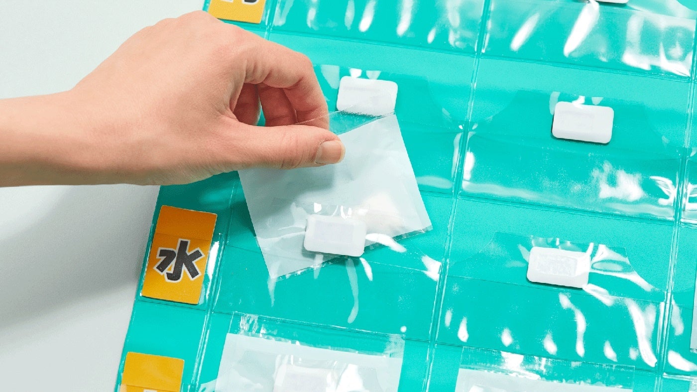 ○ 「服薬管理カレンダー」には、曜日ごとに朝・昼・夕の食後と就寝前の4つのポケットがあり、各ポケットに服用1回分の薬を1週間分格納できます。カレンダーの裏面には、印刷技術で形成した回路があり、それによって各ポケットと電子モジュールの端子をつないでいます。患者が各ポケットから薬を取り出すと、ポケットの位置と取り出した日時の情報が自動的にクラウド環境で送信されて、記録されます。