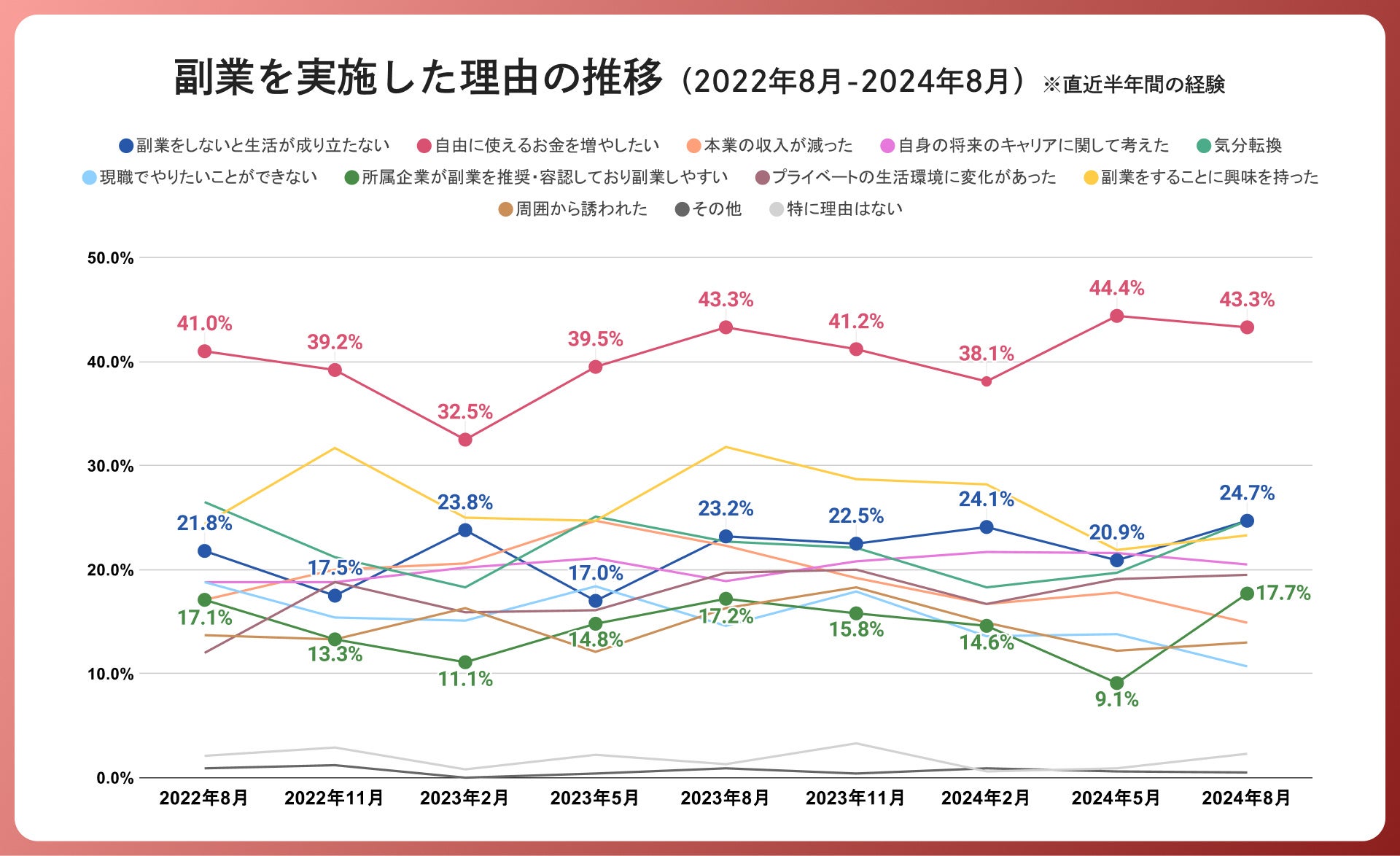 「副業を実施した理由」の推移を見ると、最も多かった回答は「自由に使えるお金を増やしたい」が43.3%で、引き続きトップである中、今回の調査では「副業をしないと生活が成り立たない」との回答が24.7%、「所属企業が副業を推奨・容認しており副業しやすい」との回答が17.7%となり、それぞれ過去最多となりました。