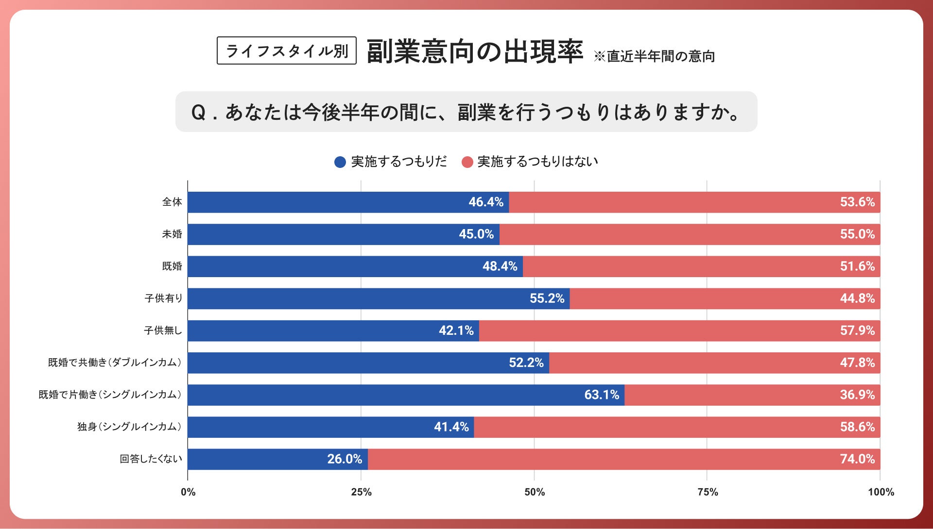 今後半年間の副業意向も、副業実施状況と類似する傾向にあり、今後半年の間に「副業を実施するつもりだ」と回答した方をライフスタイル別で見ると、既婚者、子供ありの回答者で副業意欲が全体よりも高い結果となりました。