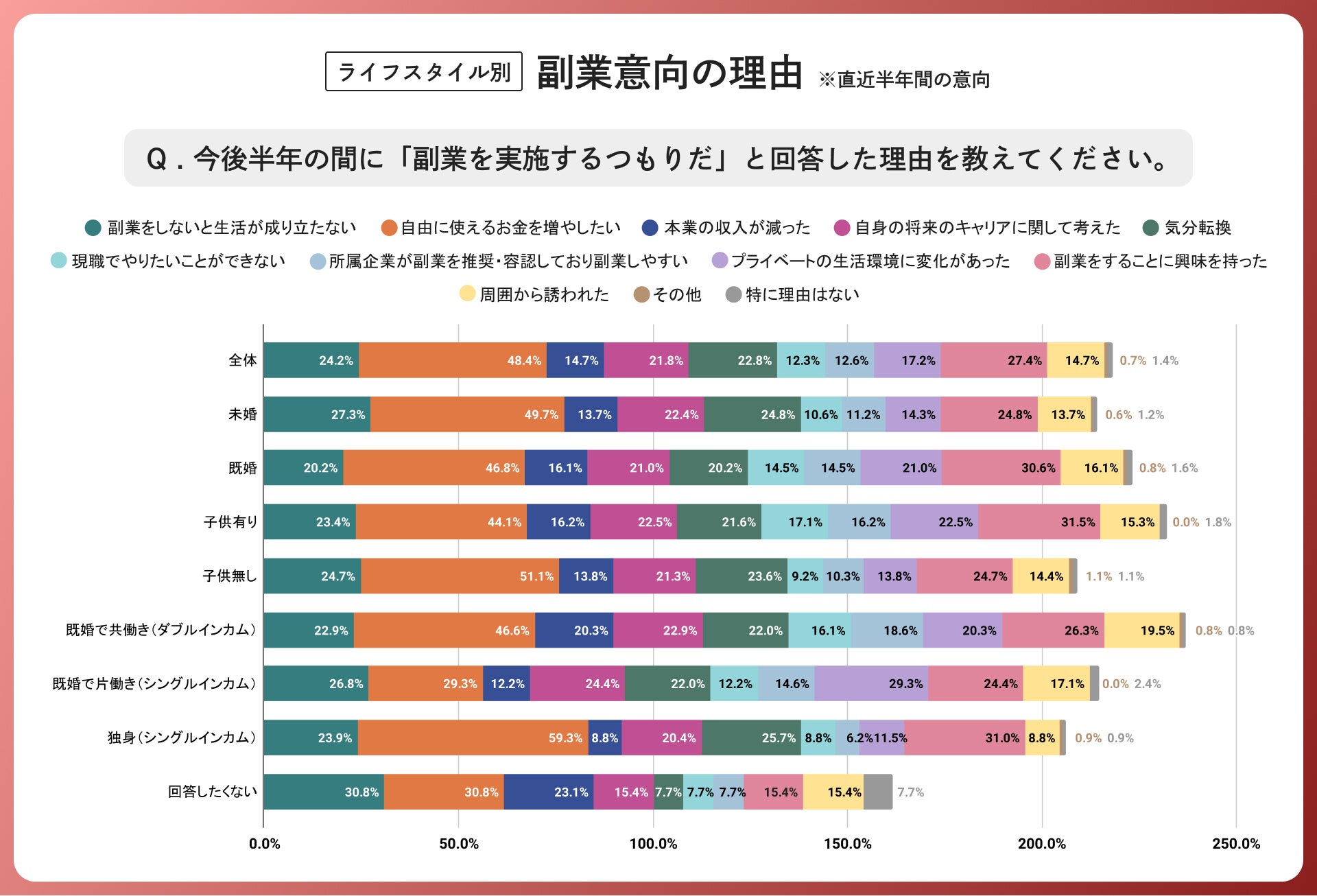 今後半年の間に「副業意向がある」との回答者の理由をライフスタイル別でみると、「副業をしないと生活が成り立たない」の回答率が最も高いのは、未婚者の27.3%であり、既婚シングルインカム世帯でも26.8%と全体よりもやや高い傾向にありました。