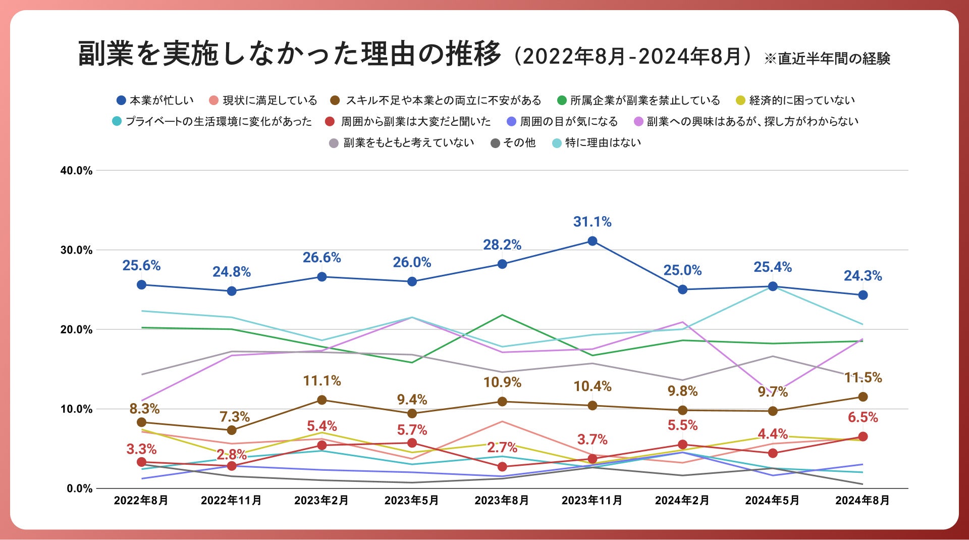 「副業を実施しなかった理由」の推移では、引き続き、「本業が忙しい」が24.3%で最多回答となりました。加えて、今回の調査では「スキル不足や本業との両立に不安がある」との回答が11.5%、「周囲から副業は大変だと聞いた」との回答が6.5%となり、過去最多となりました。