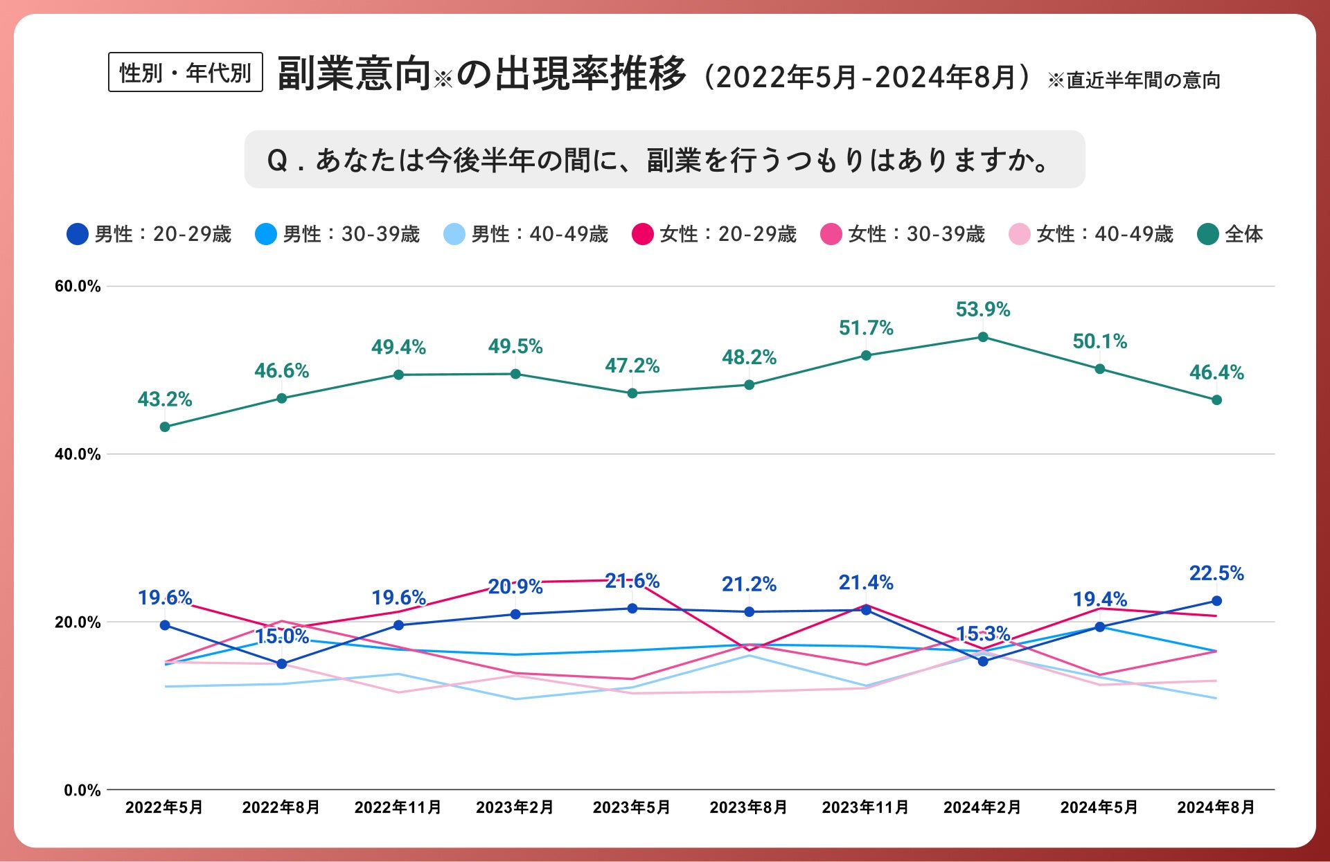 一方で、男女年代別で見ると、20代男性の副業意向は、前回調査の19.4%から22.5%に伸長しており、前年同月比で見ても1.3%増加しています。また、30代~40代女性の副業意向も前回より回復傾向にありました。