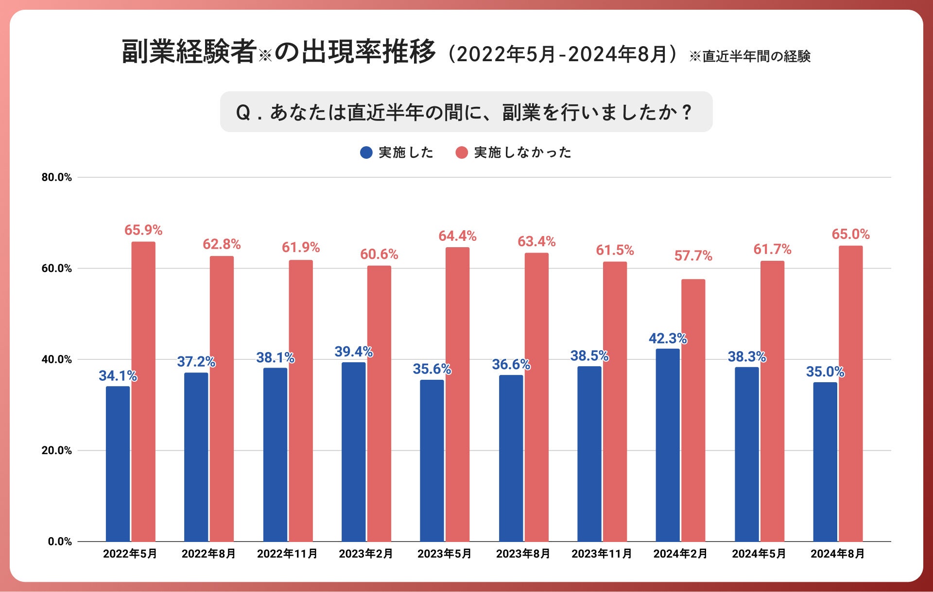 副業経験者の推移を見ると、「実施した」の回答者率は35.0%となり、前回調査(2024年5月)に続き減少しました。
