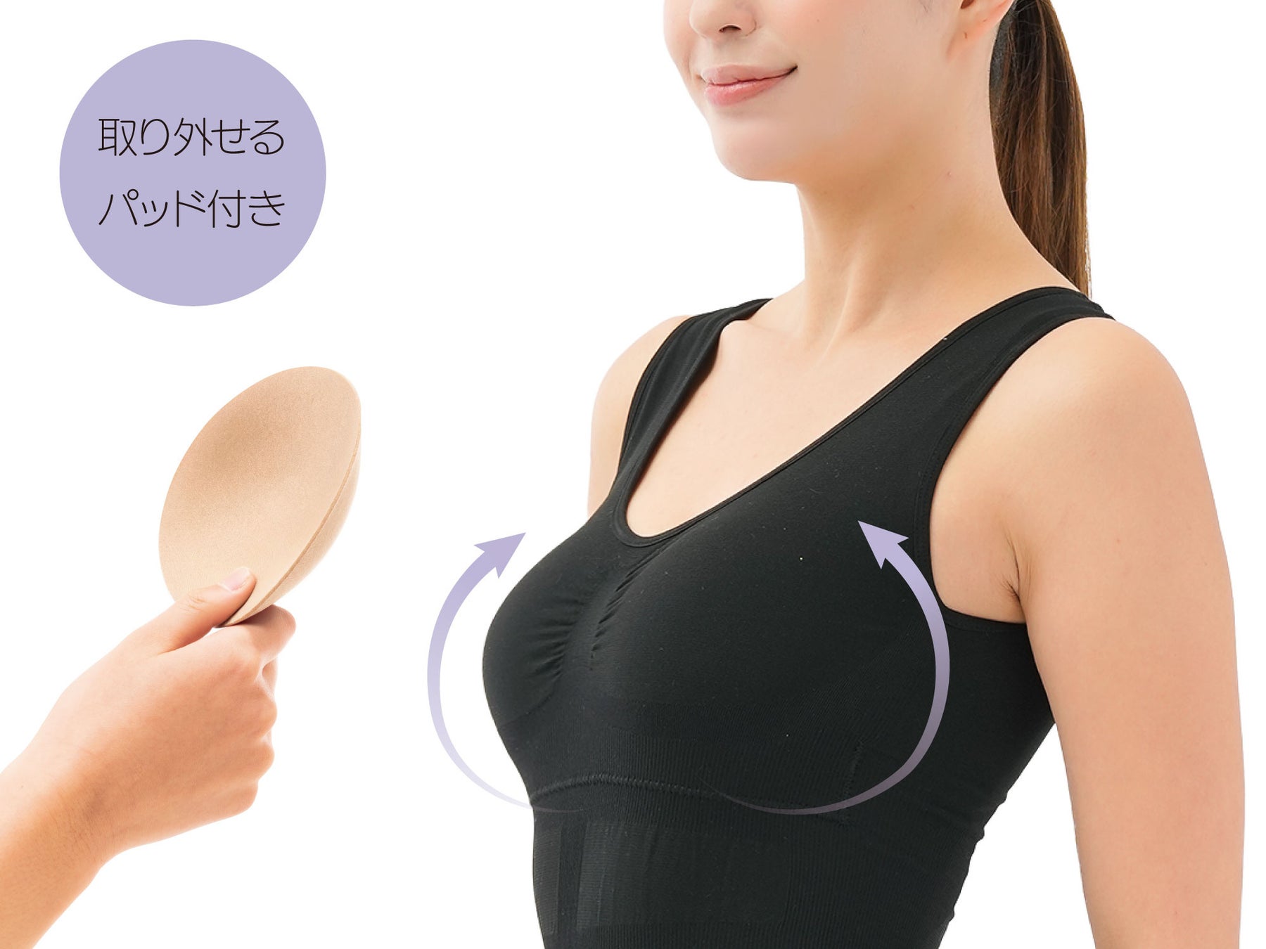 バスト部分は中心から脇にかけての着圧がバストを包み込むように持ち上げ、高い位置をキープ。