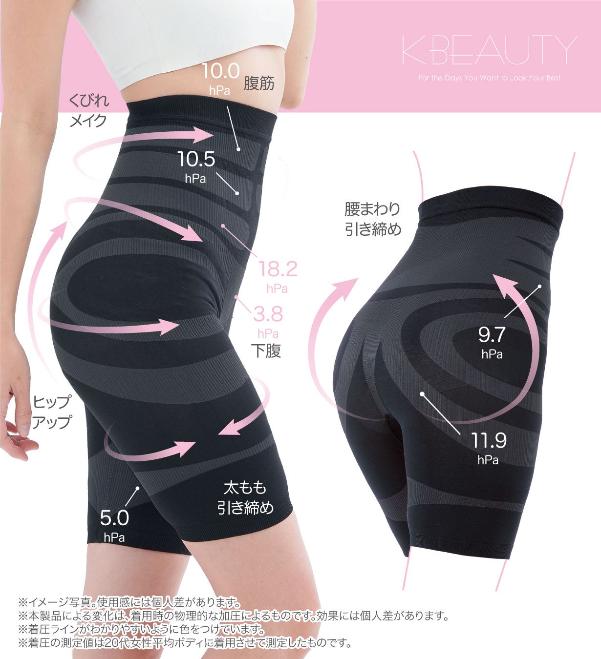 腰から腹筋に沿った着圧ラインと下腹サポートでギュッと引き締め、すっきりくびれラインを演出。