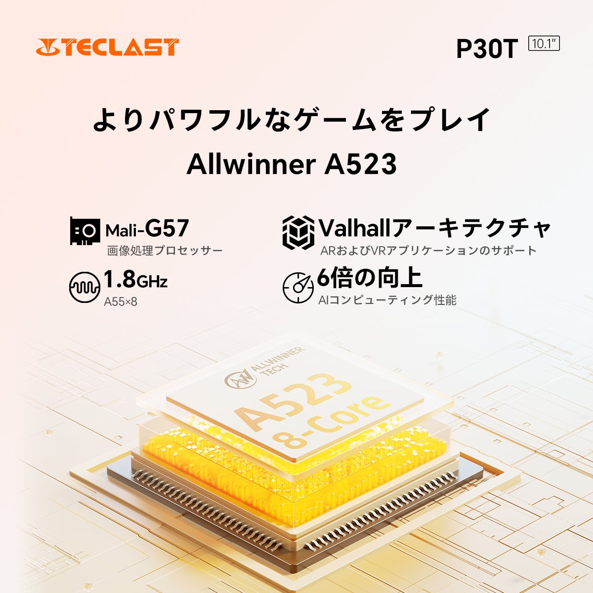 Allwinner A523は、オクタコアA55を搭載し、クアッドコアの2倍の性能とA53の6倍のAI能力を持ちます。これと相まって、ARMのValhallアーキテクチャに基づく先進中級グラフィックスプロセッサであるMali-G57は、前世代よりも60%高いパフォーマンスを発揮し、シームレスなゲームとスムーズなタブレット体験を実現します。