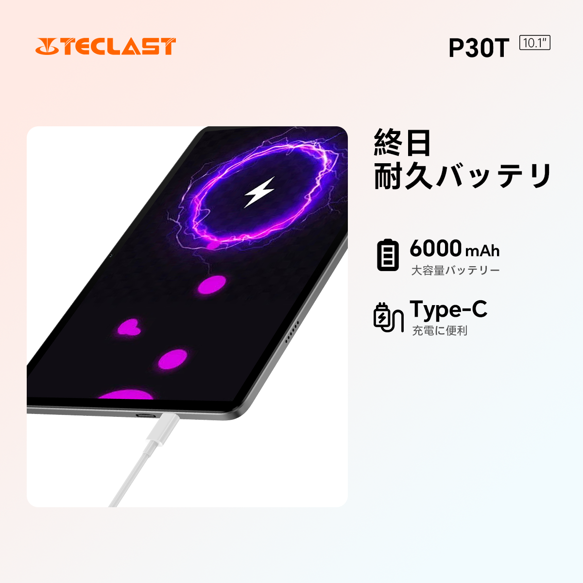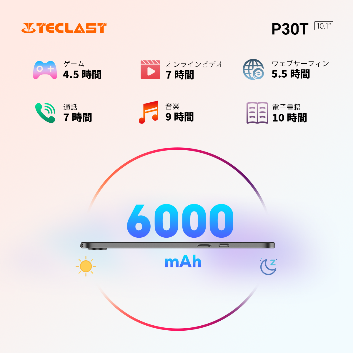 6000mAhの大容量リチウムバッテリと低消費電力プロセッサにより、最長7時間の動画視聴が可能です。Type-Cインターフェースは、どちら向きでも挿入可能で、充電がより便利になります。