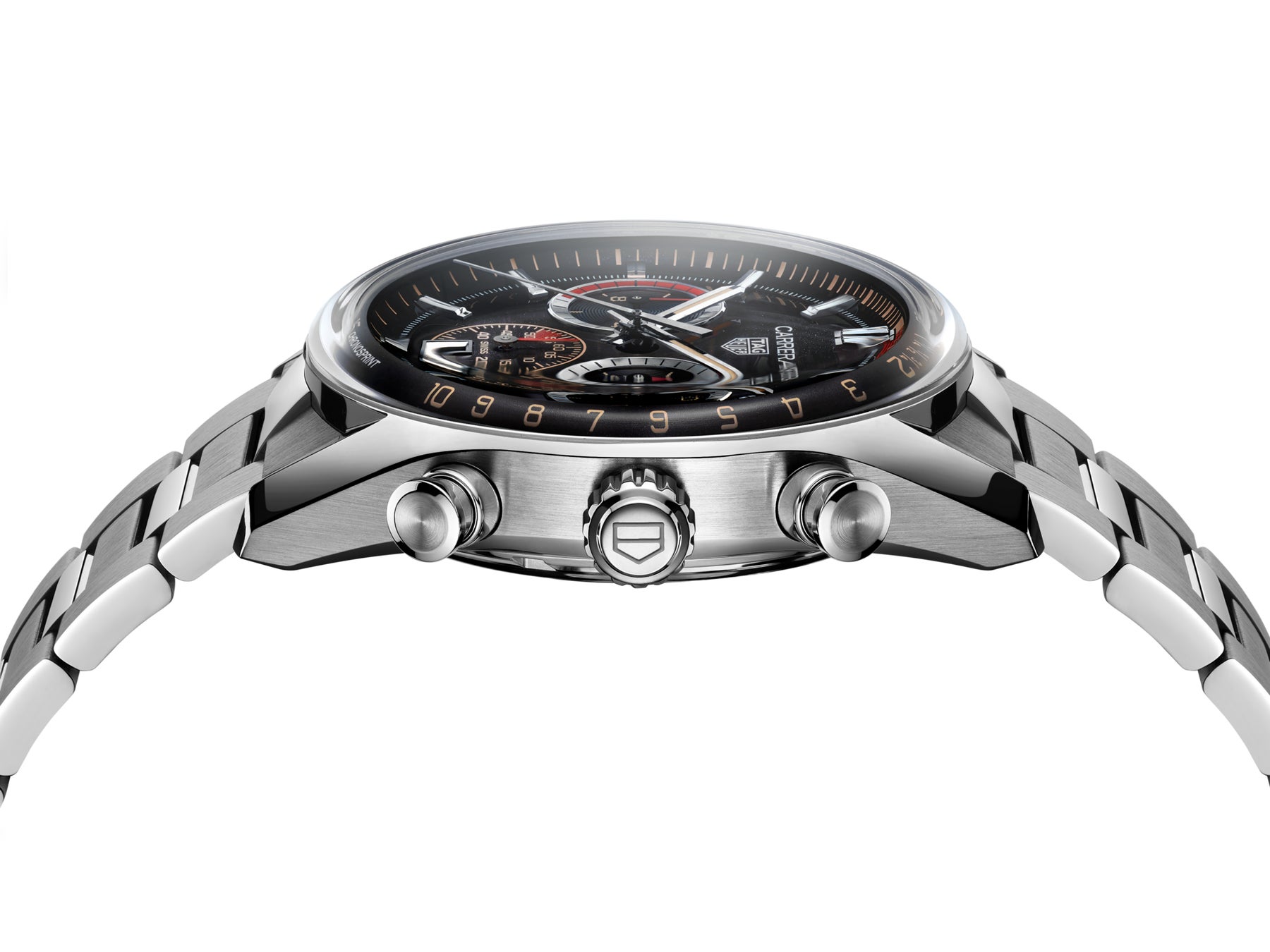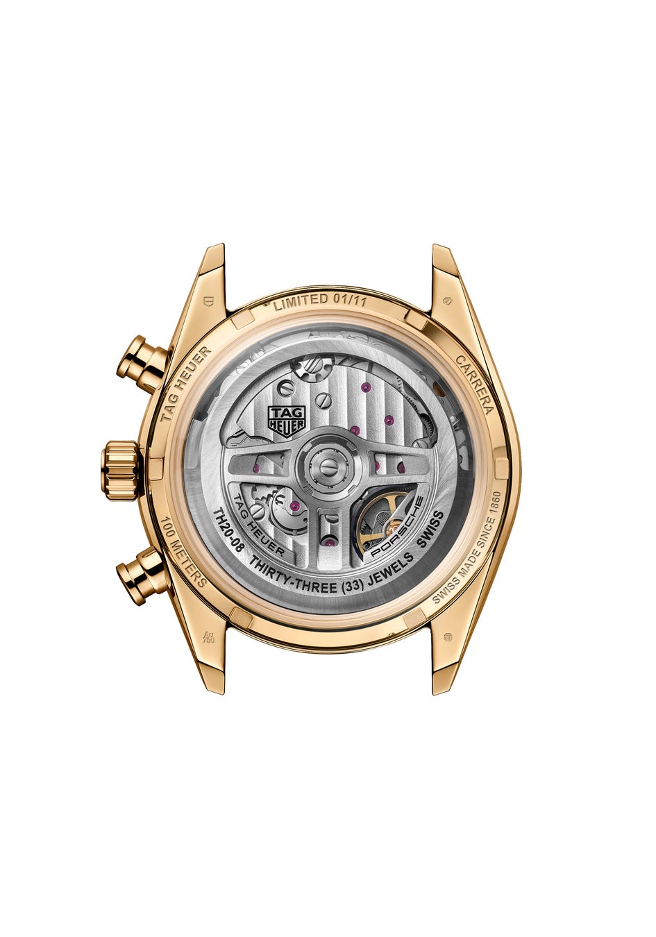 「タグ・ホイヤー カレラ クロノスプリント x ポルシェ ラリー」は、このパイオニア精神を受け継ぎながら、最新の技術革新を取り入れたタイムピース。自社製ムーブメントTH20-08を搭載し、約80時間という驚異のパワーリザーブを誇るクロノグラフです。TH20-08のクロノグラフ機構は、ポルシェとのパートナーシップのために特別に開発されたもので、2つのスネイル (かたつむり) 型ホイールにより、中央の秒針が1分の最初の15秒間は加速して動き、その後減速してきっかり1分で一周します。サファイアクリスタルのケースバックから見えるポルシェのステアリングホイールを模したローターが、このタイムピースと911に込められたエンジニアリングの伝統をつなぐもうひとつの印象的な絆を形作っています。