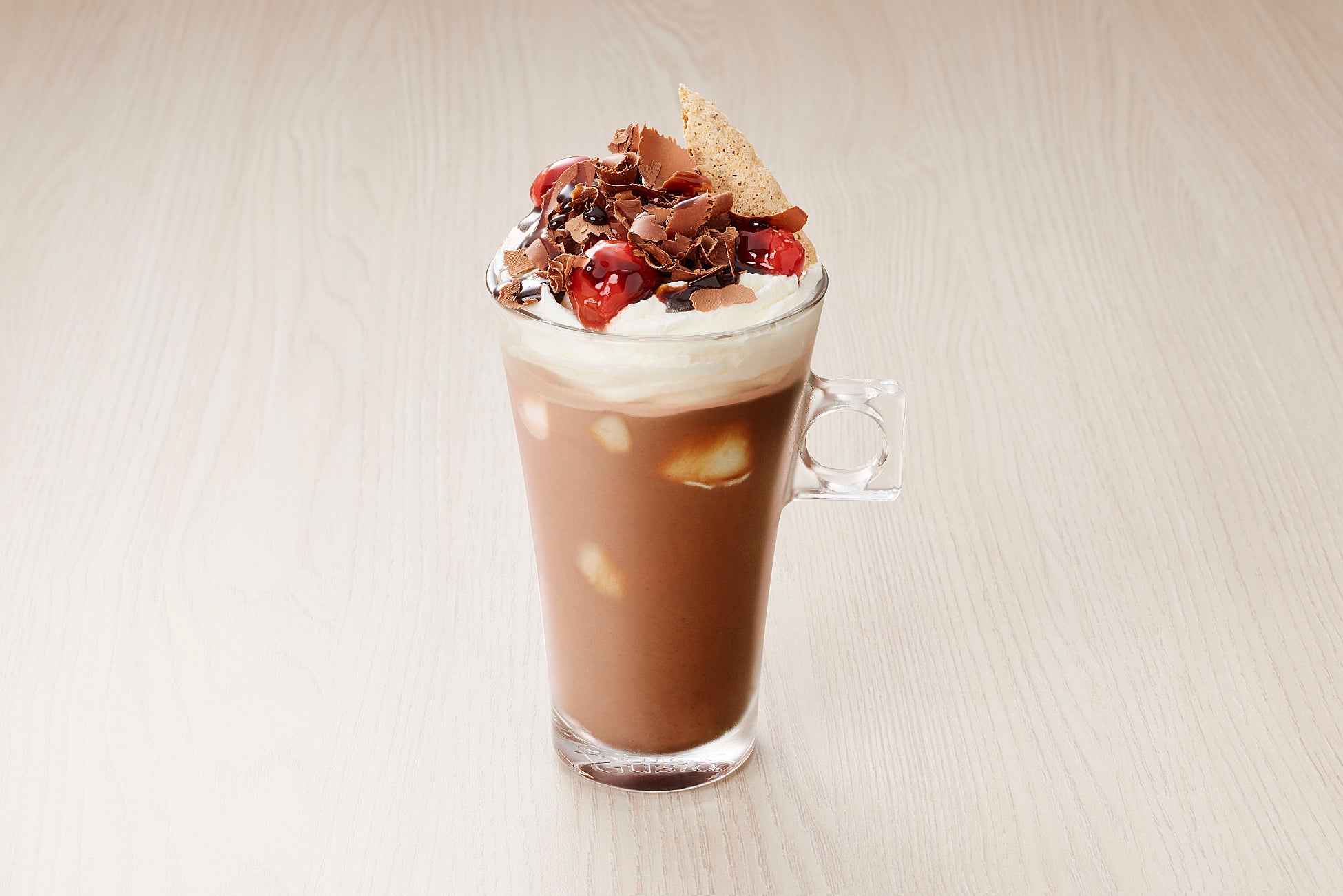 スイスで親しまれるサクランボのチョコレートケーキを、「ネスカフェ ドルチェ グスト チョコチーノ」を使って表現した冷たいデザートドリンク。甘酸っぱいチェリーのコンポート、スイス産チョコレートのコポー(削ったチョコ)、口の中でとろけるサクッとしたアーモンド風味のメレンゲ菓子で仕上げた、”飲むケーキ”。