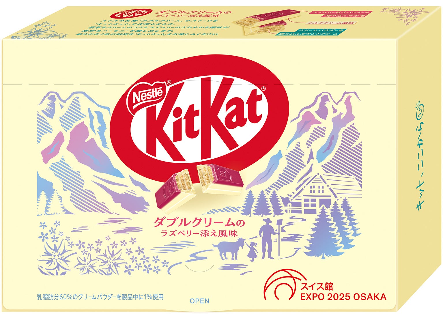 スイスパビリオンで販売されている「キットカット ダブルクリームのラズベリー添え風味」から着想を得て、スイス人シェフによって作られたスイスパビリオン限定スイーツ。スイスで愛される乳製品の一つであるヨーグルトにレモンの爽やかさと、ラズベリーの華やかさを組み合わせ、香ばしいほうじ茶ムースのまろやかさで包んだスポンジムースケーキ。最後に、「キットカット ダブルクリームのラズベリー添え風味」のトッピングで仕上げている。ケーキの断面でも「キットカット ダブルクリームのラズベリー添え風味」を表現している。