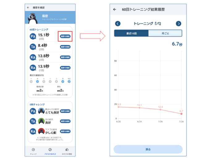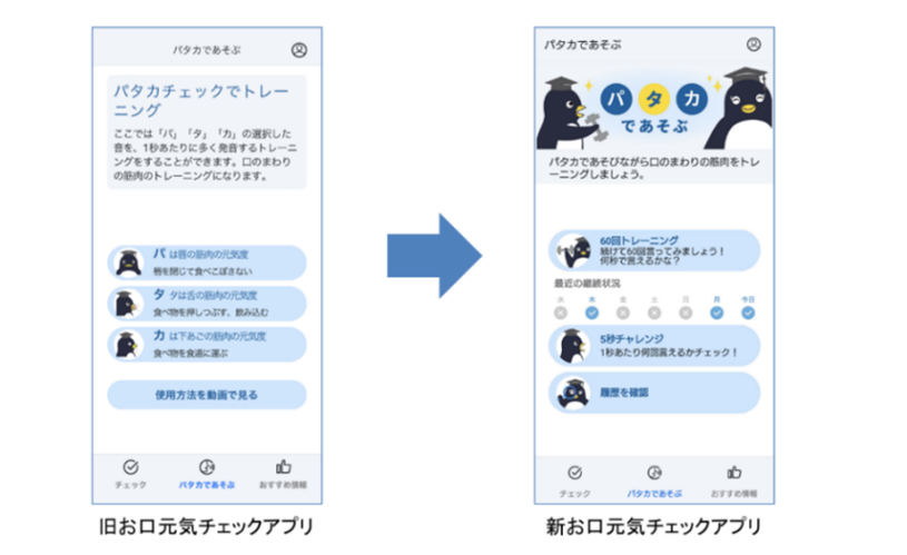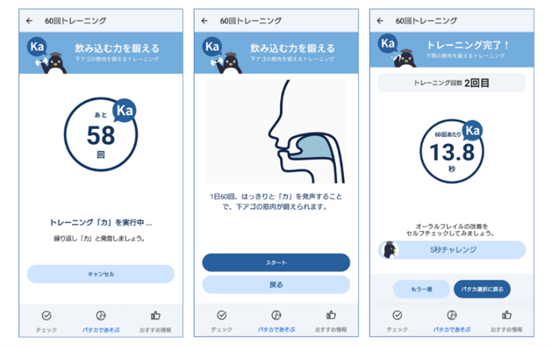 このたび、「1つのアプリでトレーニングもお口の状態のチェックもできるようにして欲しい」とのお客様の声にお応えし、「おくち元気チェック」アプリに、お口の筋力トレーニング機能「60回トレーニング」と履歴確認機能を追加しました※。「60回トレーニング」では「パ」「タ」「カ」「ラ」から一音選び、その音をできるだけ速く60回発声することでお口の筋力を鍛えます。オーラルフレイル予防にはささいな変化を見逃さずに早い段階でお口の変化に気づき、健康な状態に戻すための適切なケアとトレーニングを継続していくことが重要です。履歴確認機能では、トレーニング結果の経過をグラフで確認すること、トレーニングの継続日数を記録することが可能になりました。