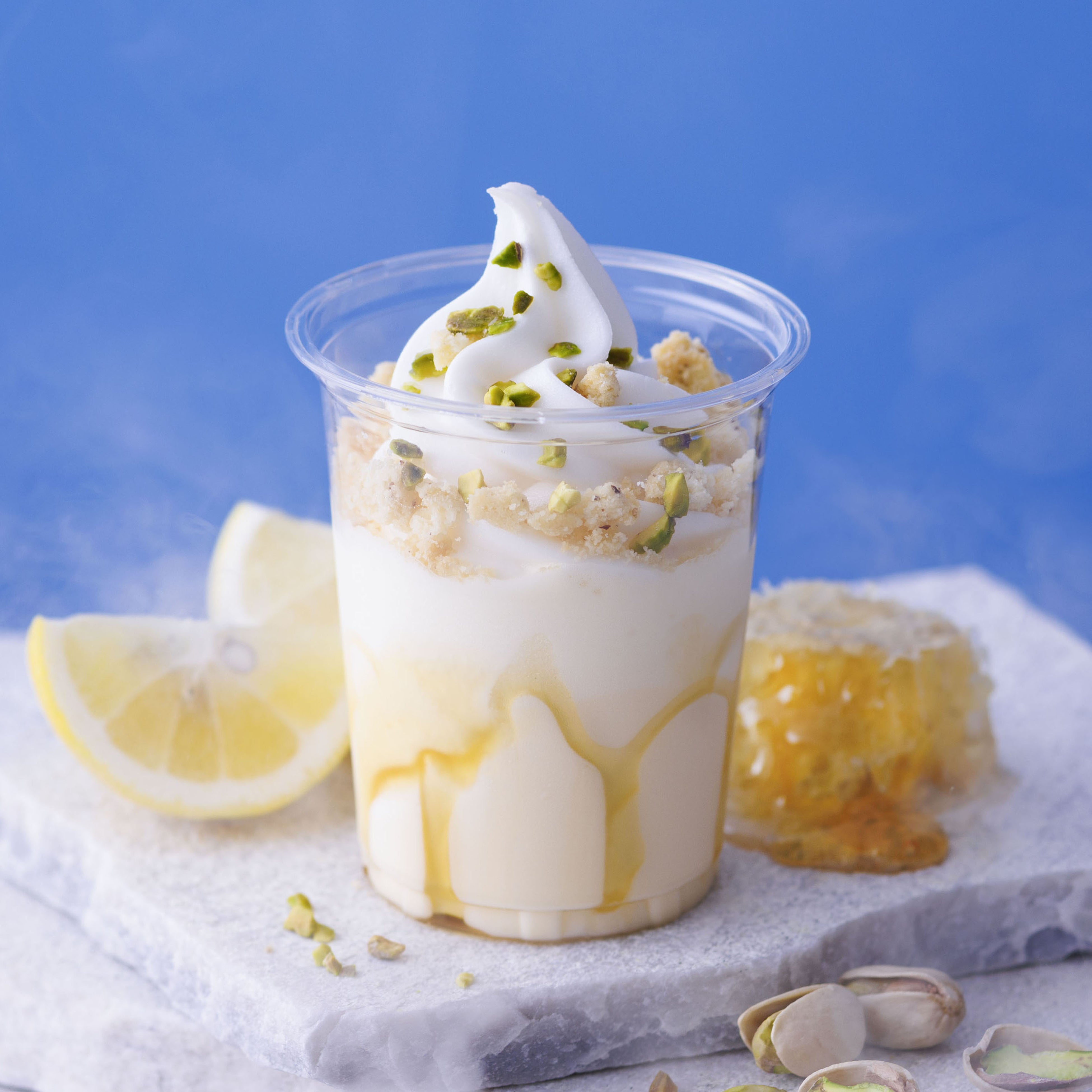 シェイクとソフトクリームに重なるはちみつのまろやかな甘さ、レモンのさっぱりとした酸味、バタークッキーとピスタチオの異なる食感―。それぞれのおいしさが詰まった、BUTTER&beeらしさあふれるオリジナルスイーツです。