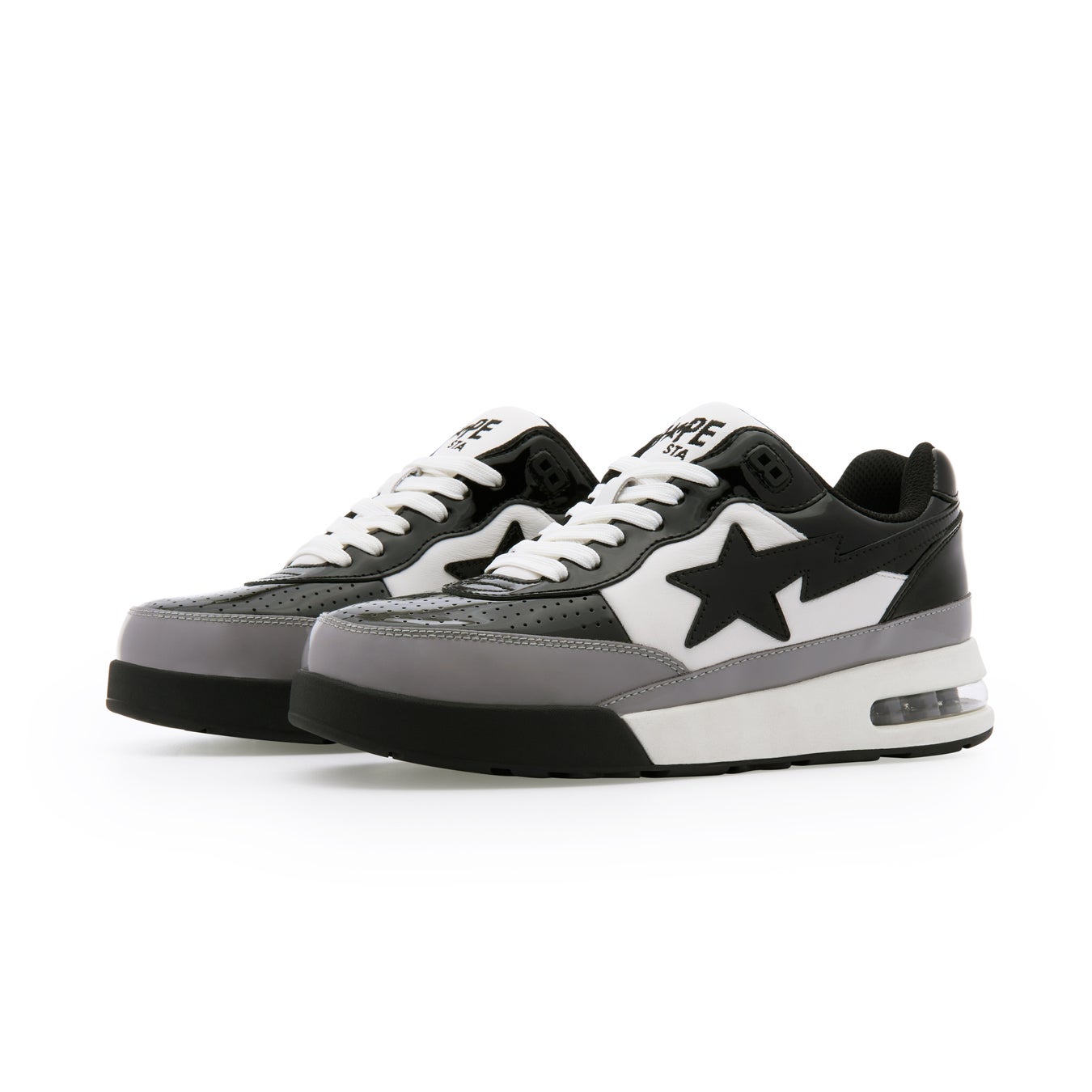 パテント素材のトゥボックスがアクセントとなり、ラグジュアリーでモダンな美しい仕上がりに。エアクッションを搭載したラバーソールは、優れたグリップ力と快適な履き心地を実現し、見た目と実用性を兼ね備えた一足です。