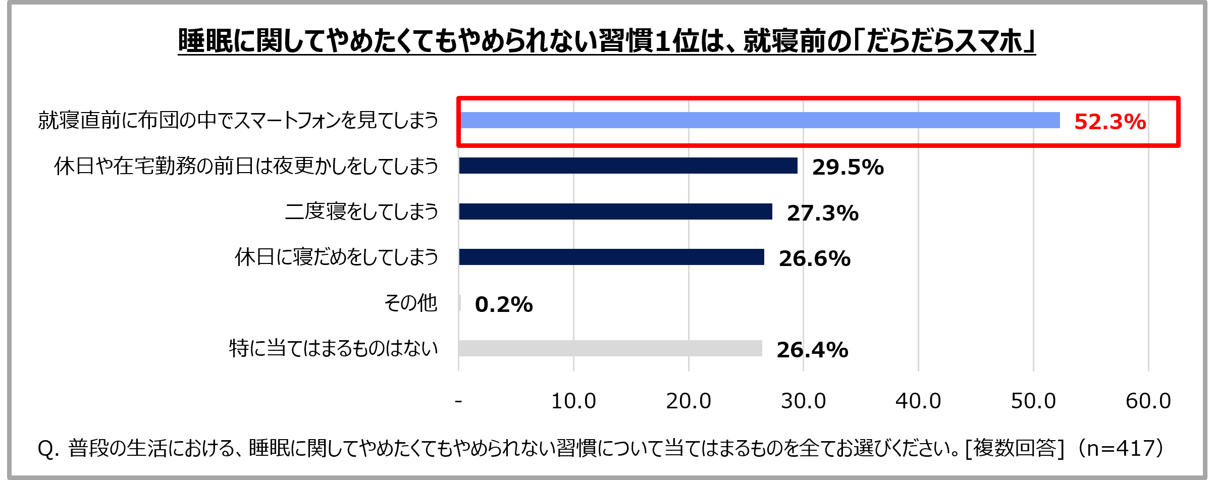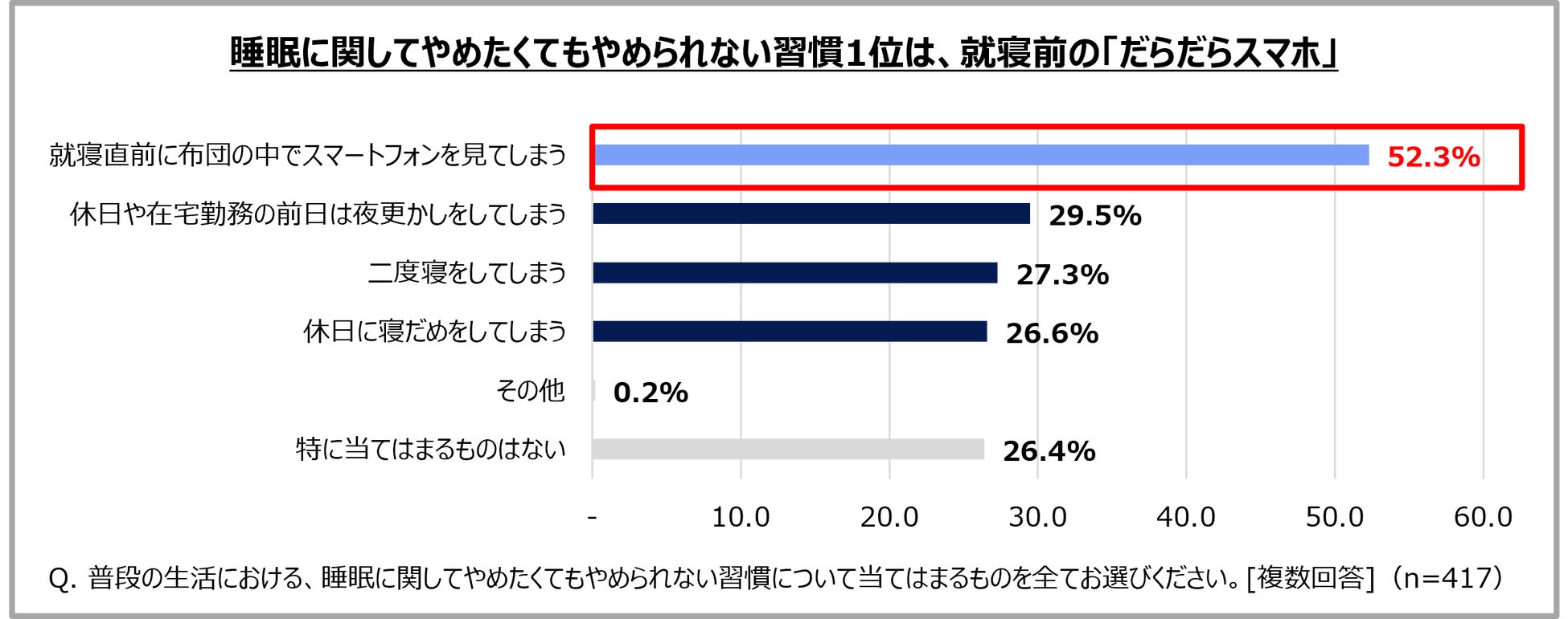 睡眠に関してやめられない習慣1位は就寝前の「だらだらスマホ」。半数以上がやめられないと回答。